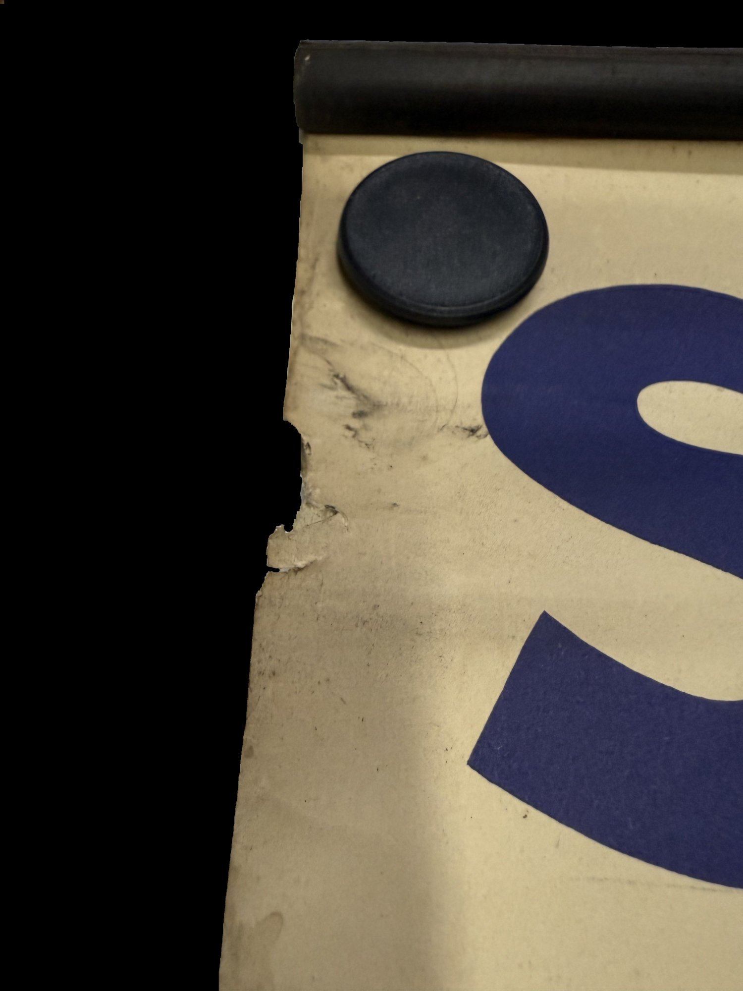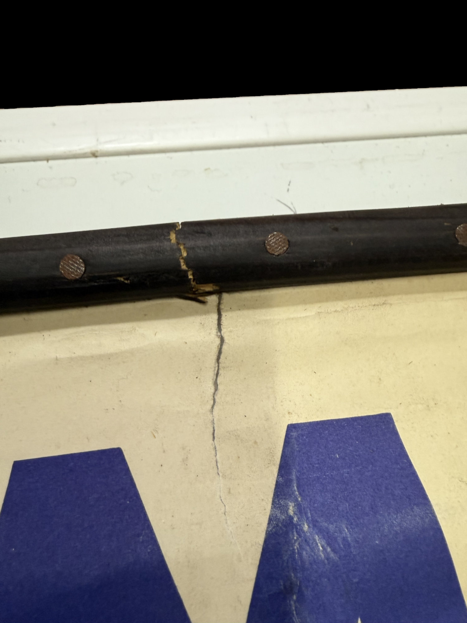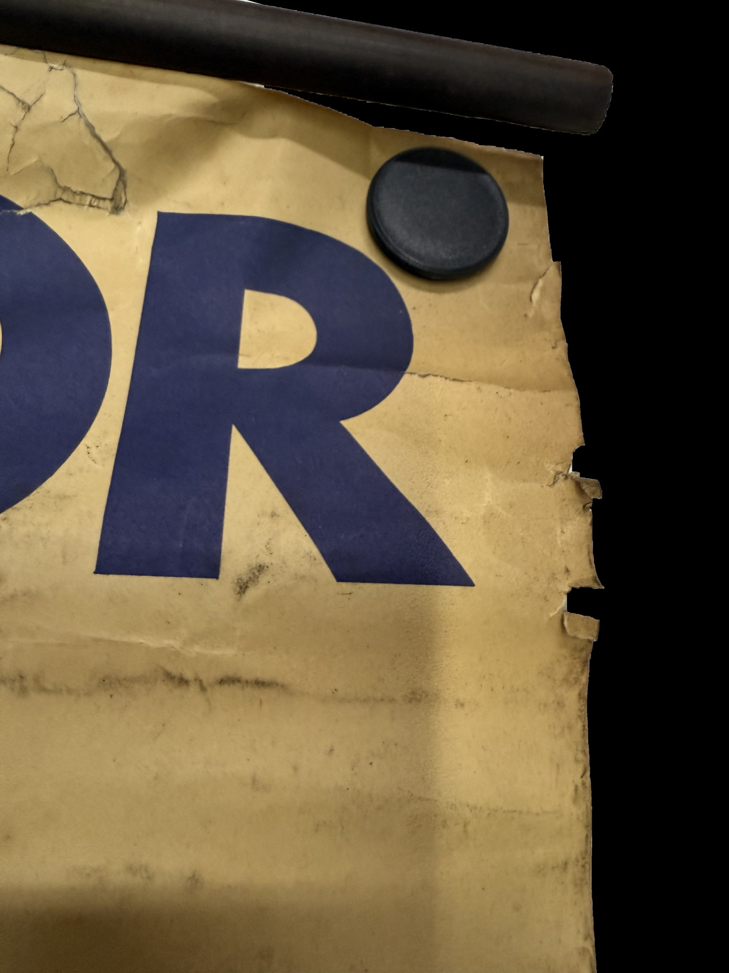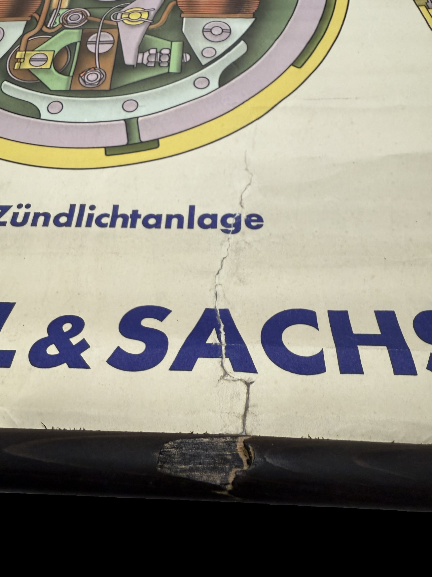 Stammt aus einer alten Werkstatt, die wir jüngst räumen durften. Farben sind super. Der Gesamtzustand aufgrund der auf den Detailfotos zu sehenden Mängeln leider nur mittelmäßig. Wir haben zwei-drei Beschädigungen von hinten gesichert, um ein weiteres Ein- oder Ausreißen zu verhindern. Auf den ersten Blick eigentlich besser als hier von uns bewertet. Mit etwas Liebe kann hier noch viel herausgeholt werden. Ca. 110 x 78 cm. Oben und unten mit Holzleisten.