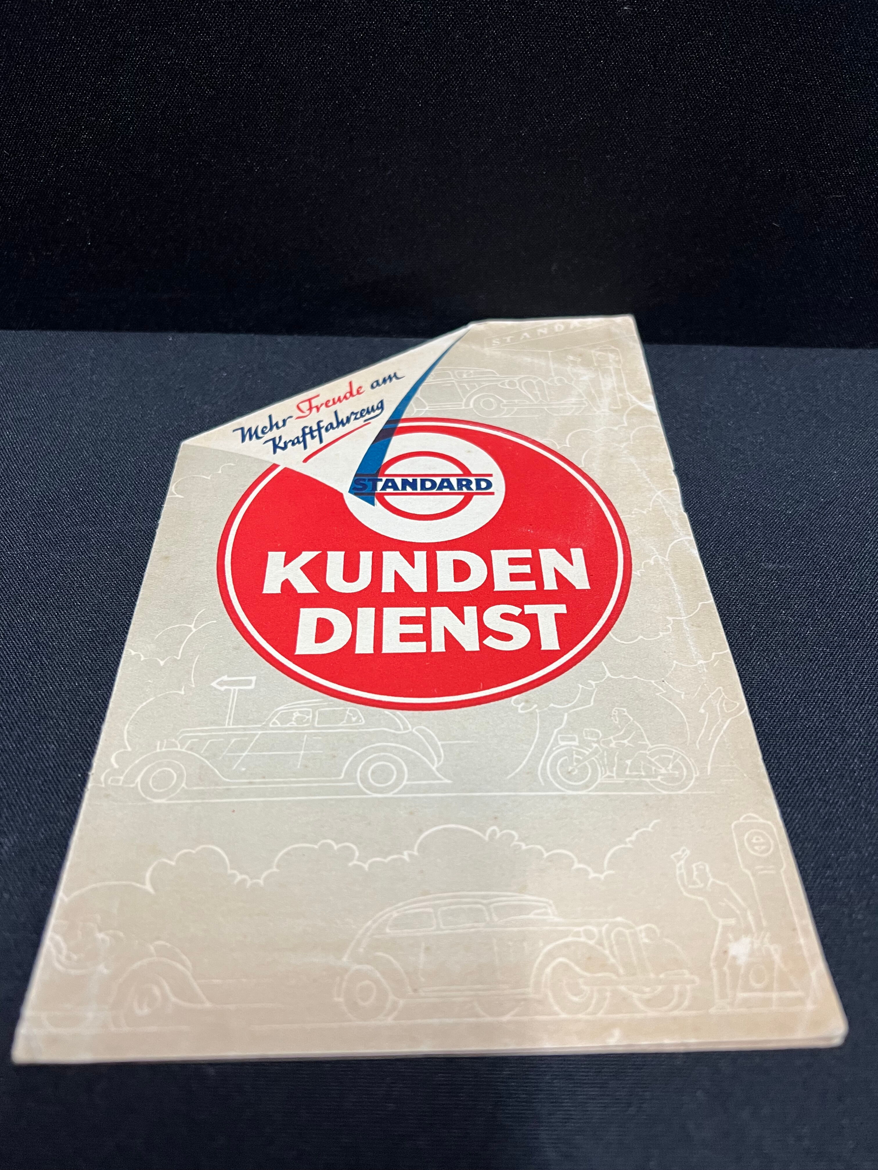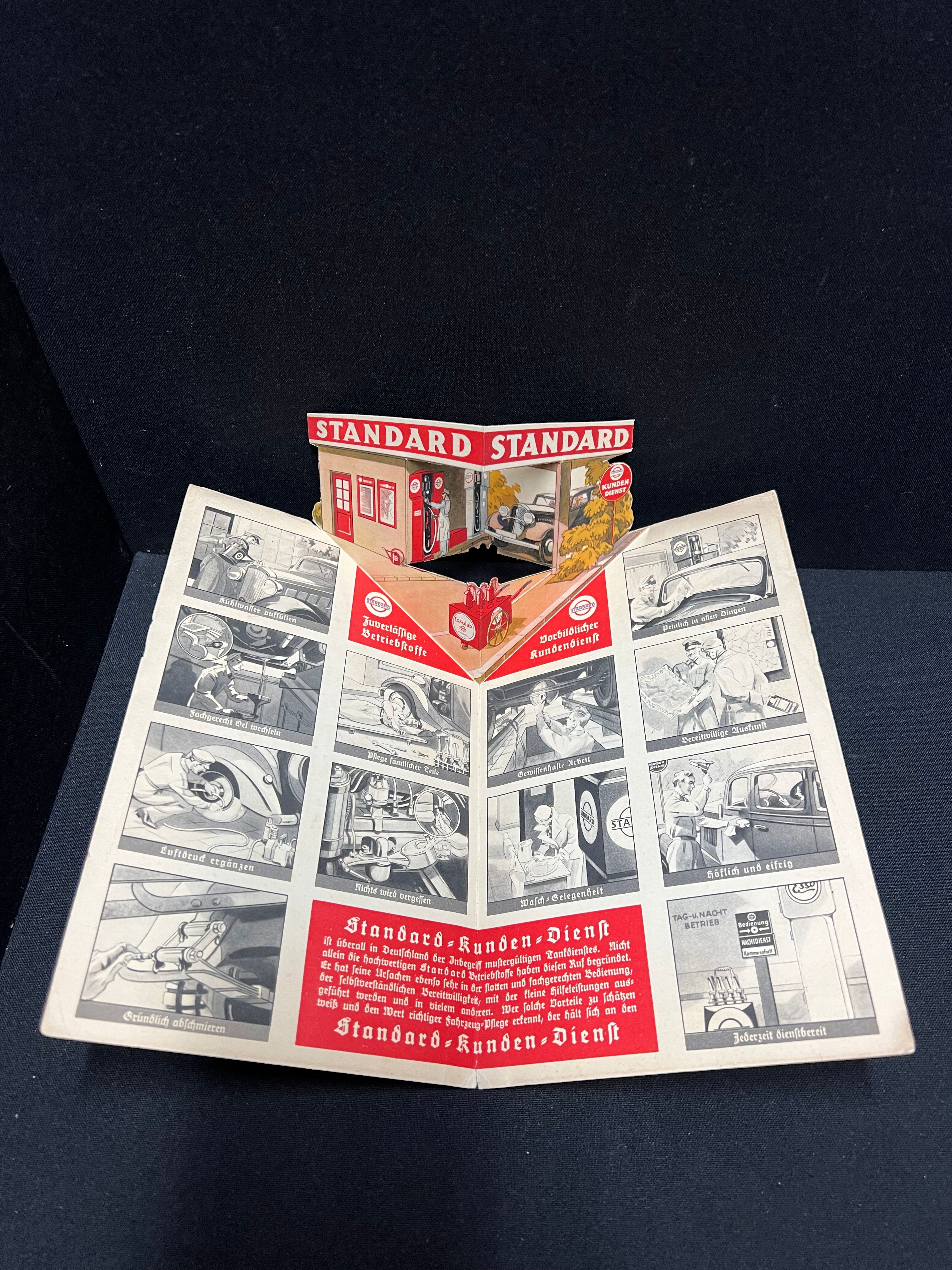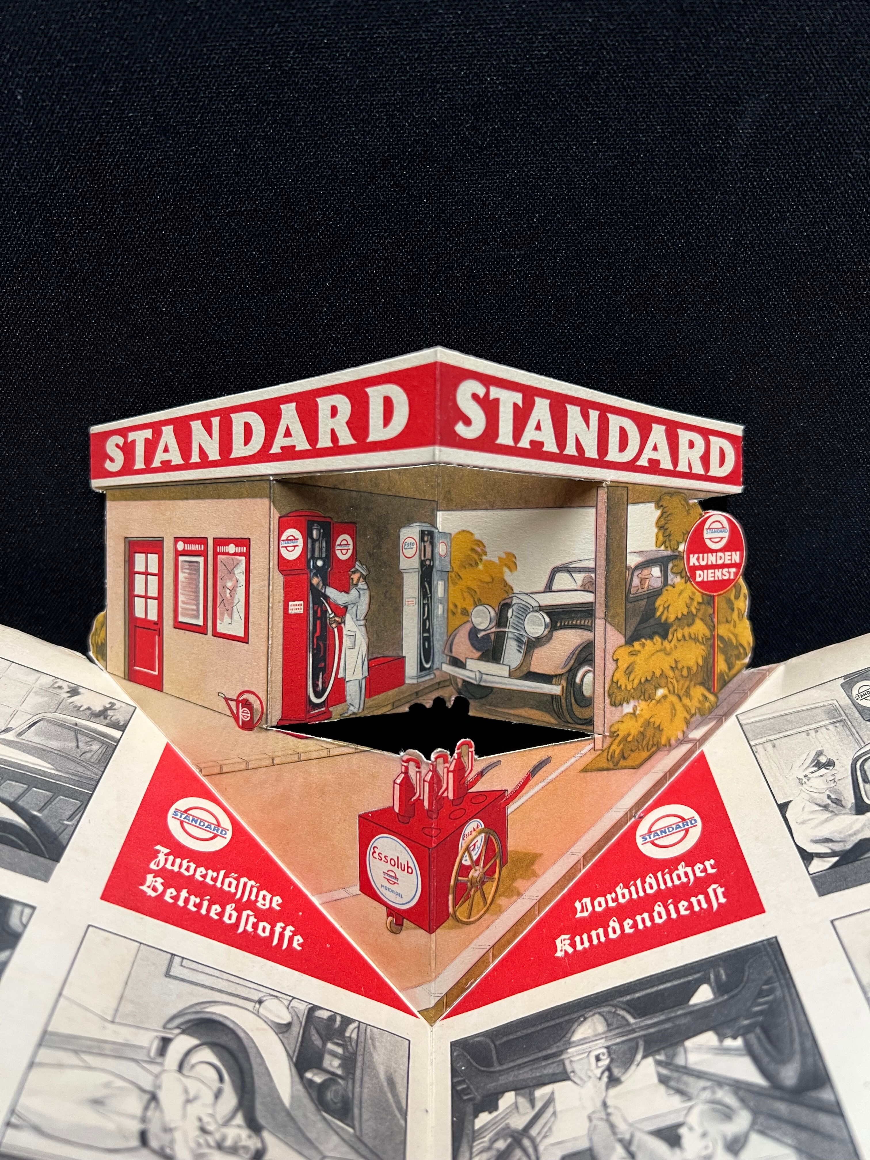 Standard Aufklappwerbeprospekt im Comicstil mit Pop-Up-Tankstelle (Vorkrieg)