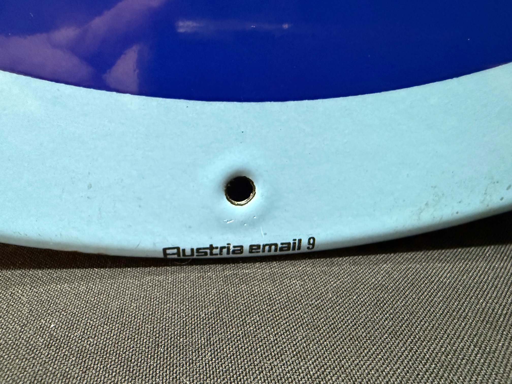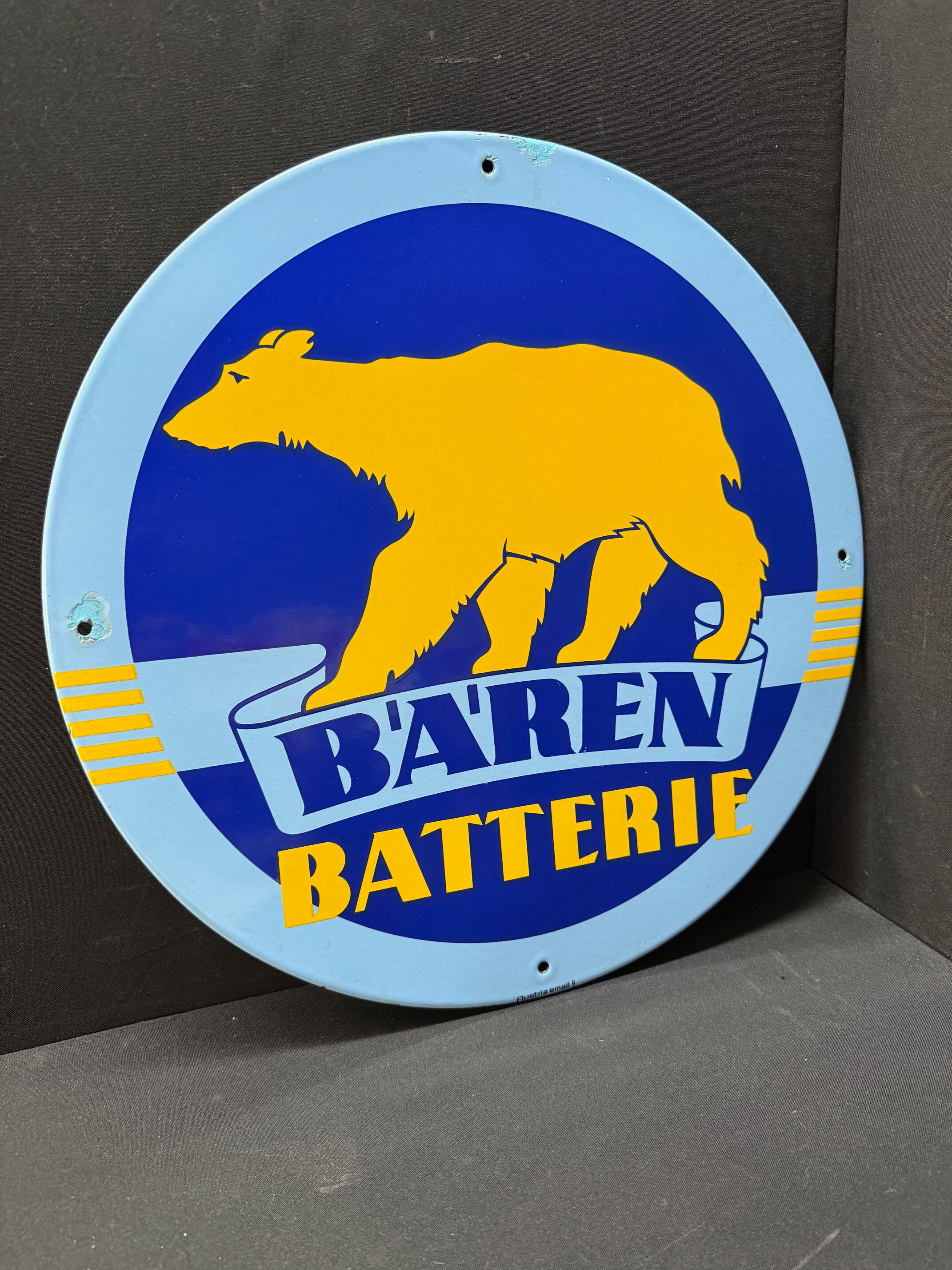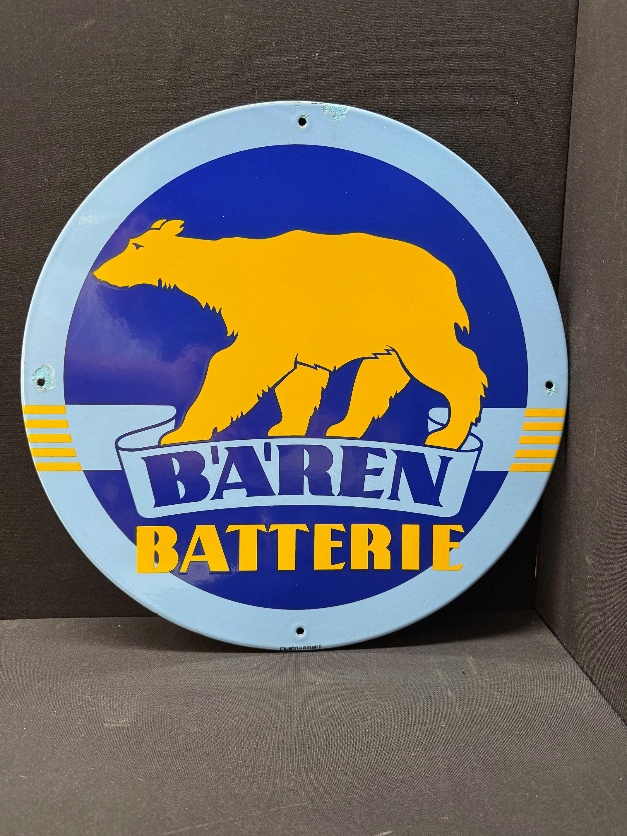 Emailschild, abgekantet, schabloniert, AT 50er Jahre, Durchmesser ca48 cm, Austria Email. Farben und Oberfläche sind super. An drei der vier Befestigungslöchern gibt es Abplatzer, die farblich beruhigt wurden. Lassen sich ggf. sicherlich schnell wieder entfernen.
