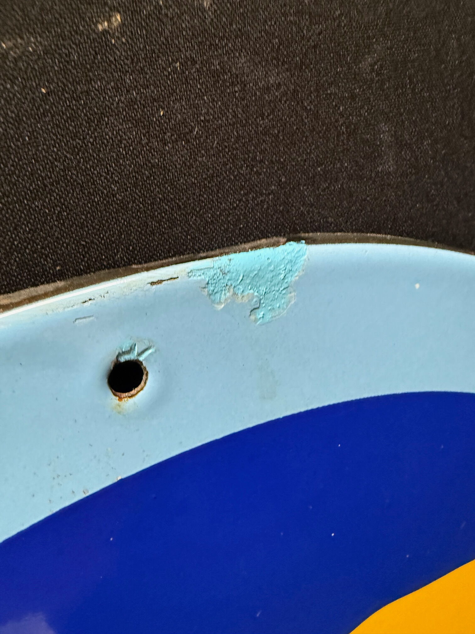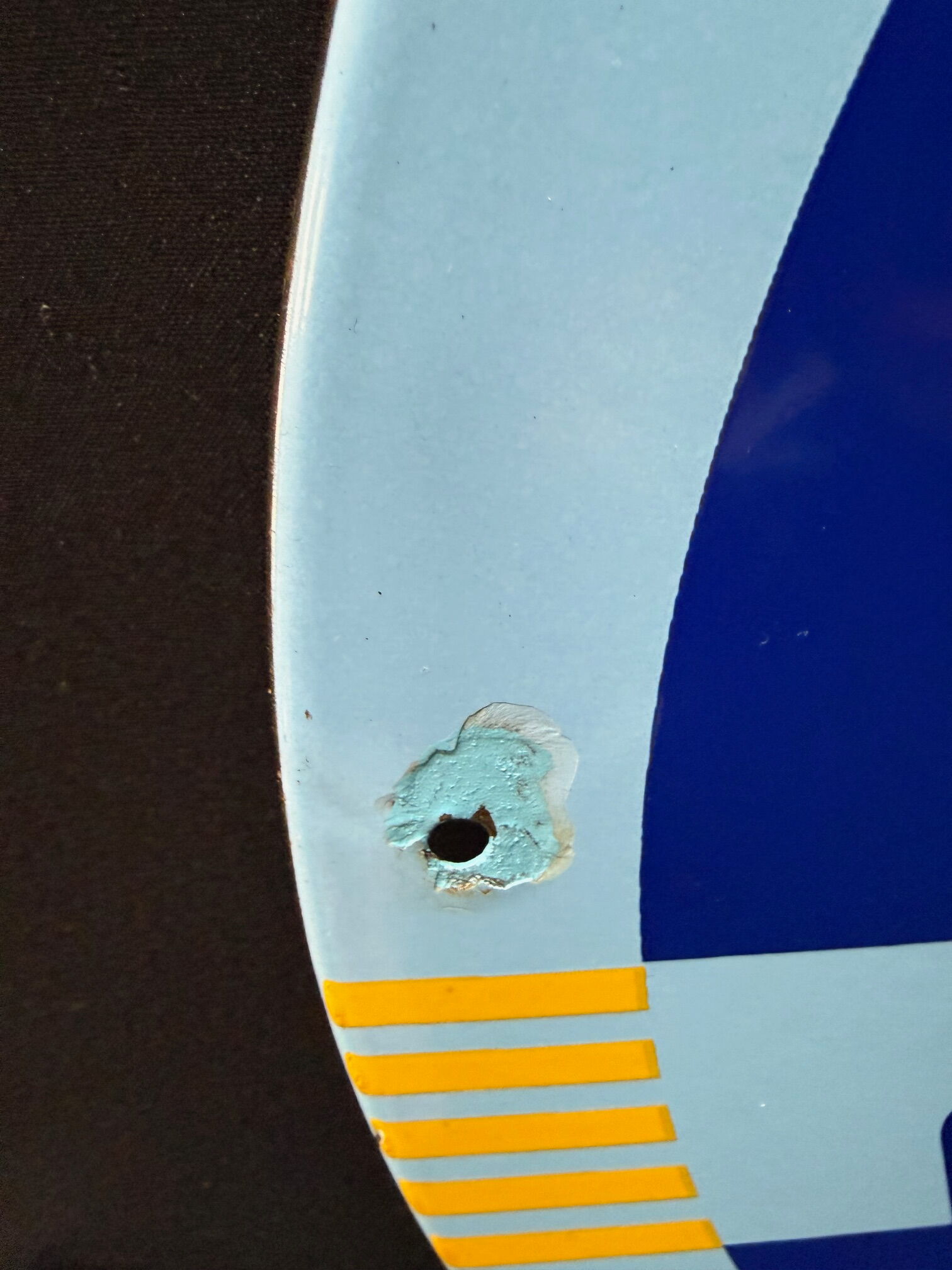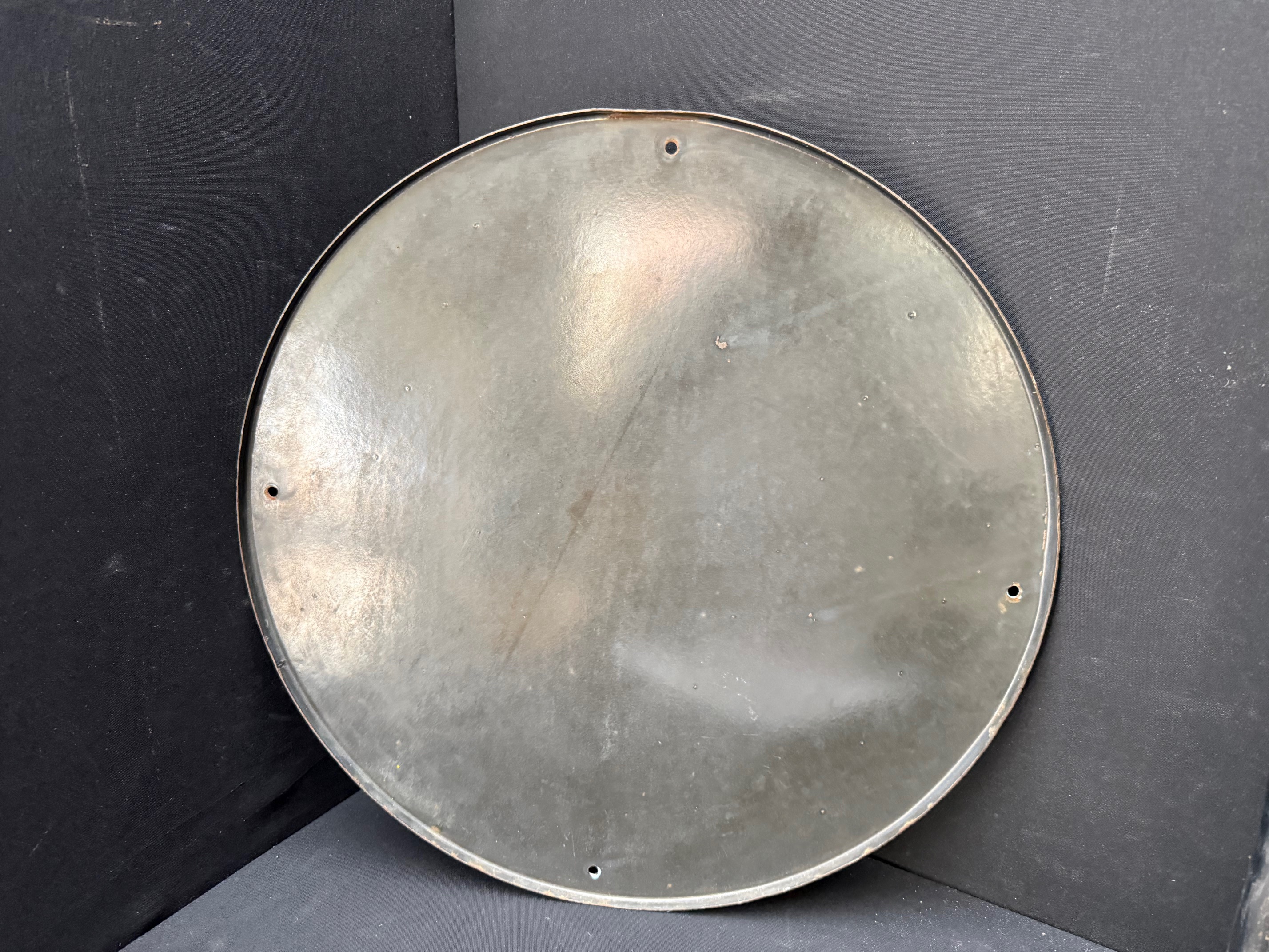 Emailschild, abgekantet, schabloniert, AT 50er Jahre, Durchmesser ca48 cm, Austria Email. Farben und Oberfläche sind super. An drei der vier Befestigungslöchern gibt es Abplatzer, die farblich beruhigt wurden. Lassen sich ggf. sicherlich schnell wieder entfernen.