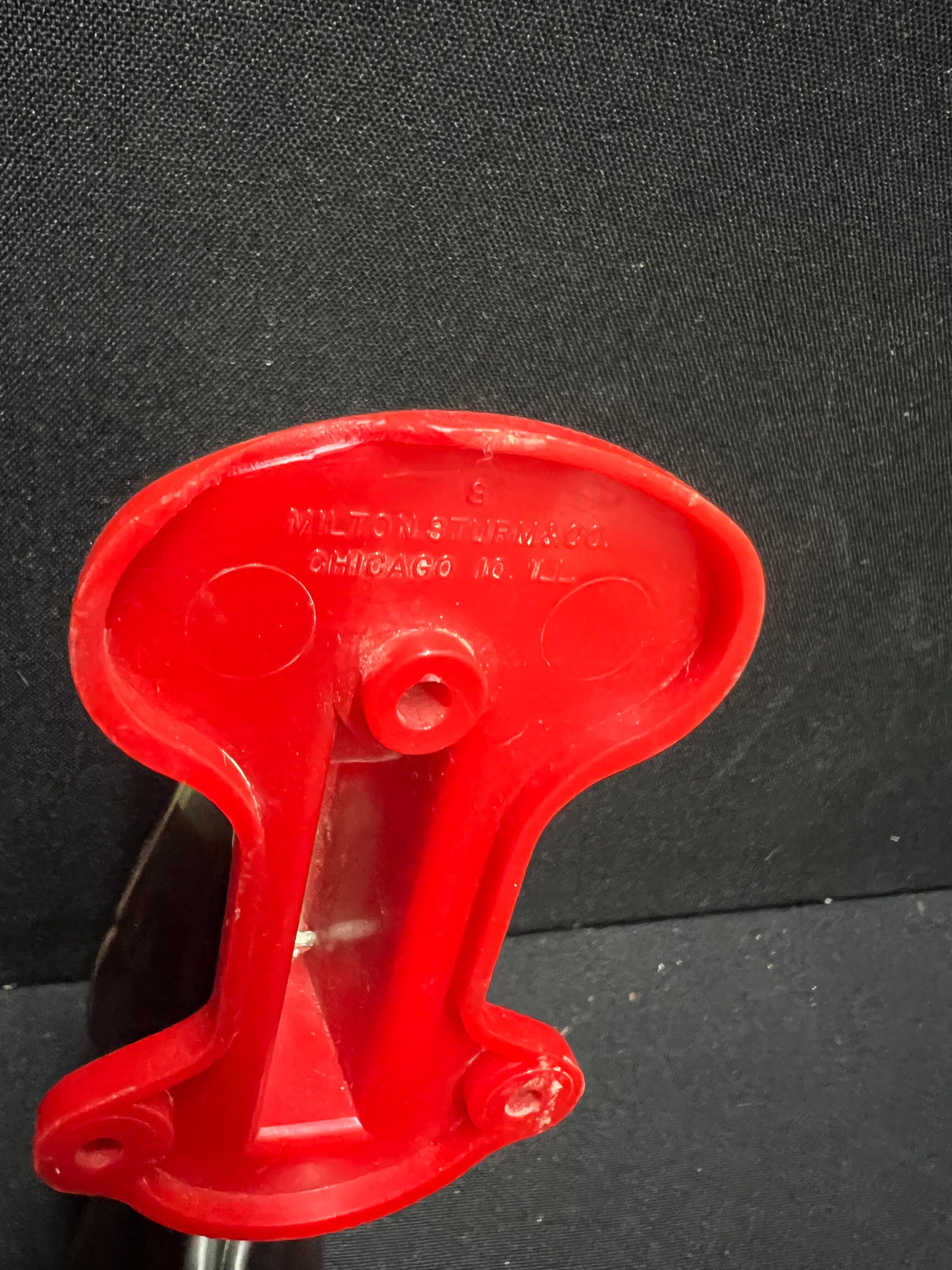 Sehr seltenes Stück aus den USA.  Gemarkt mit Milton Sturm & Co. Rückwärtig mit von vorne quasi unsichtbarer Verletzung am roten Kunststoff. Ansonsten alles super. Könnte problemlos auch wieder als Türgriff fungieren. Ca. 20 cm.