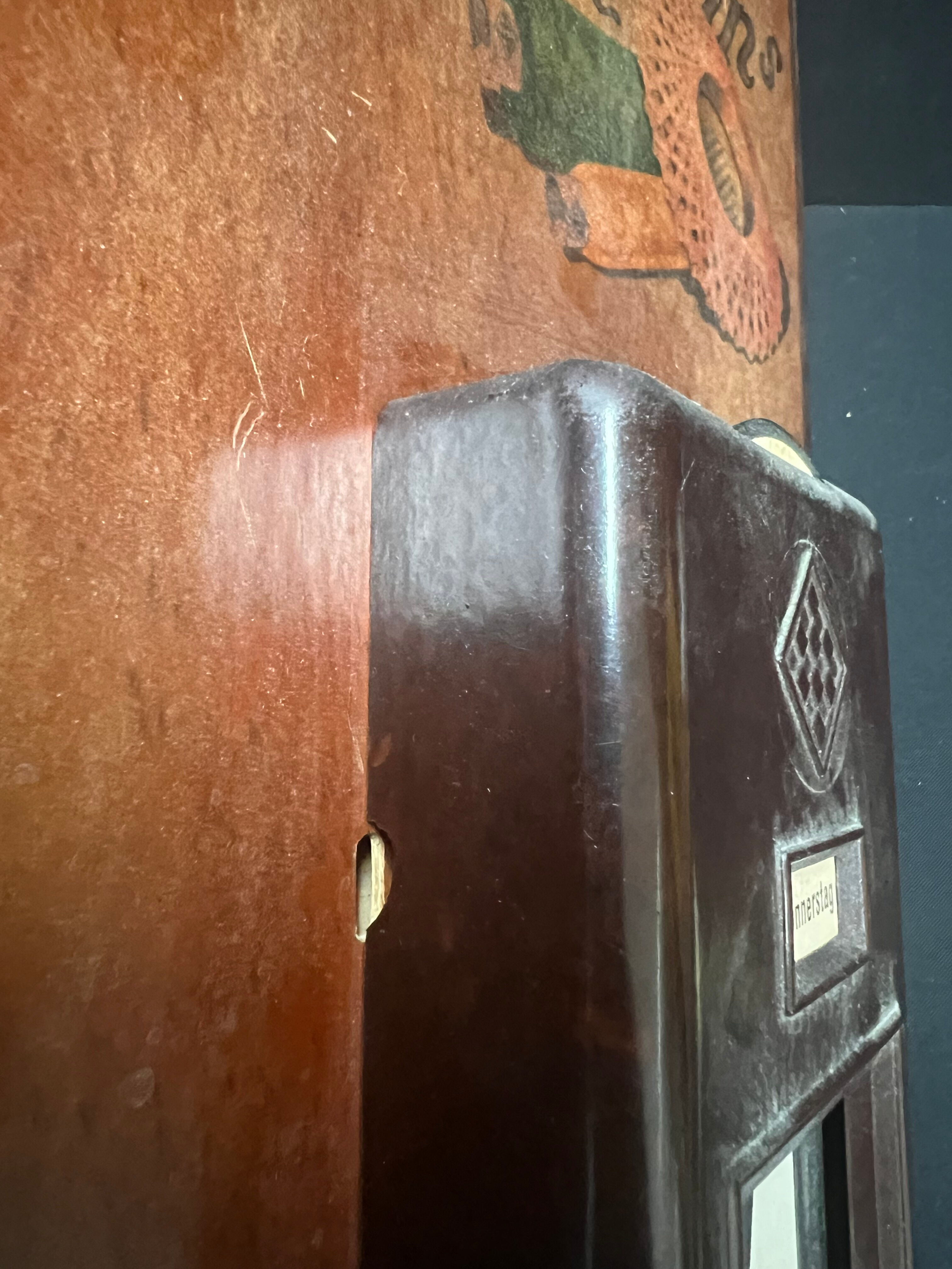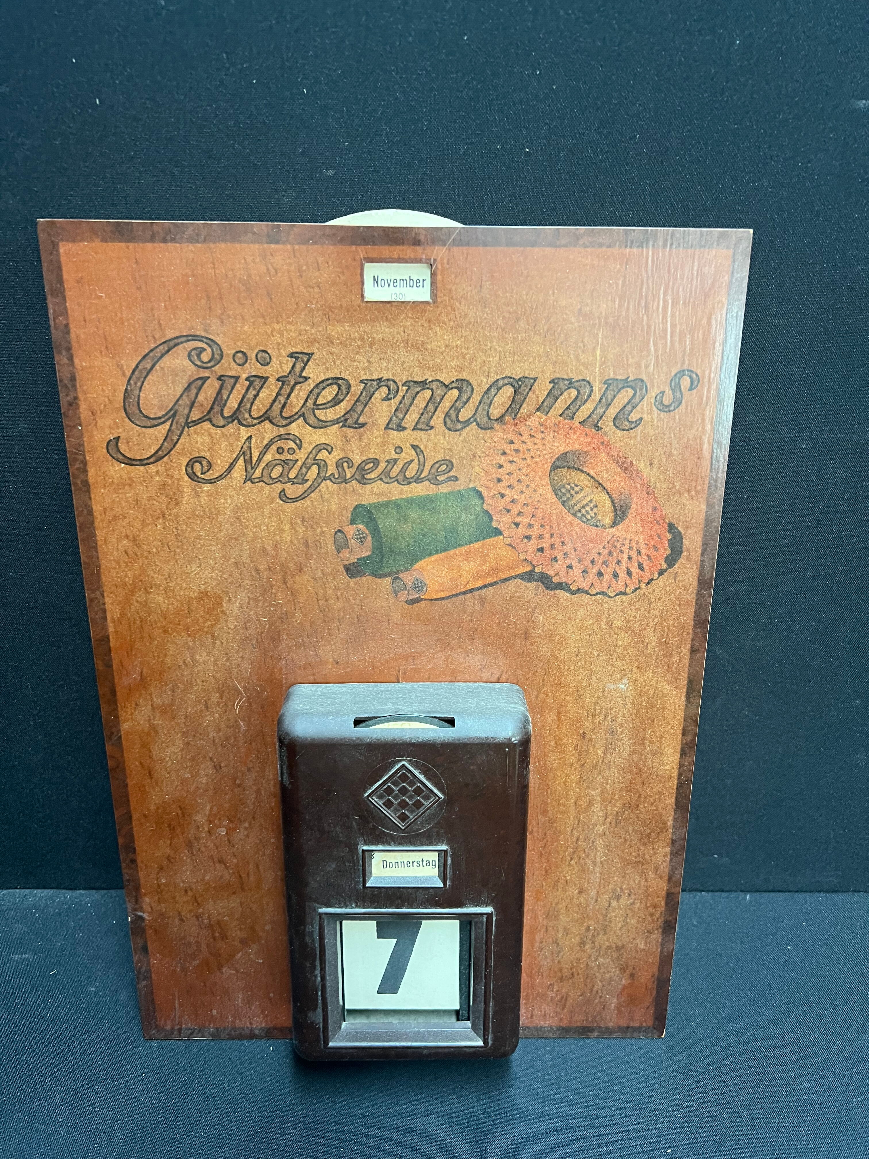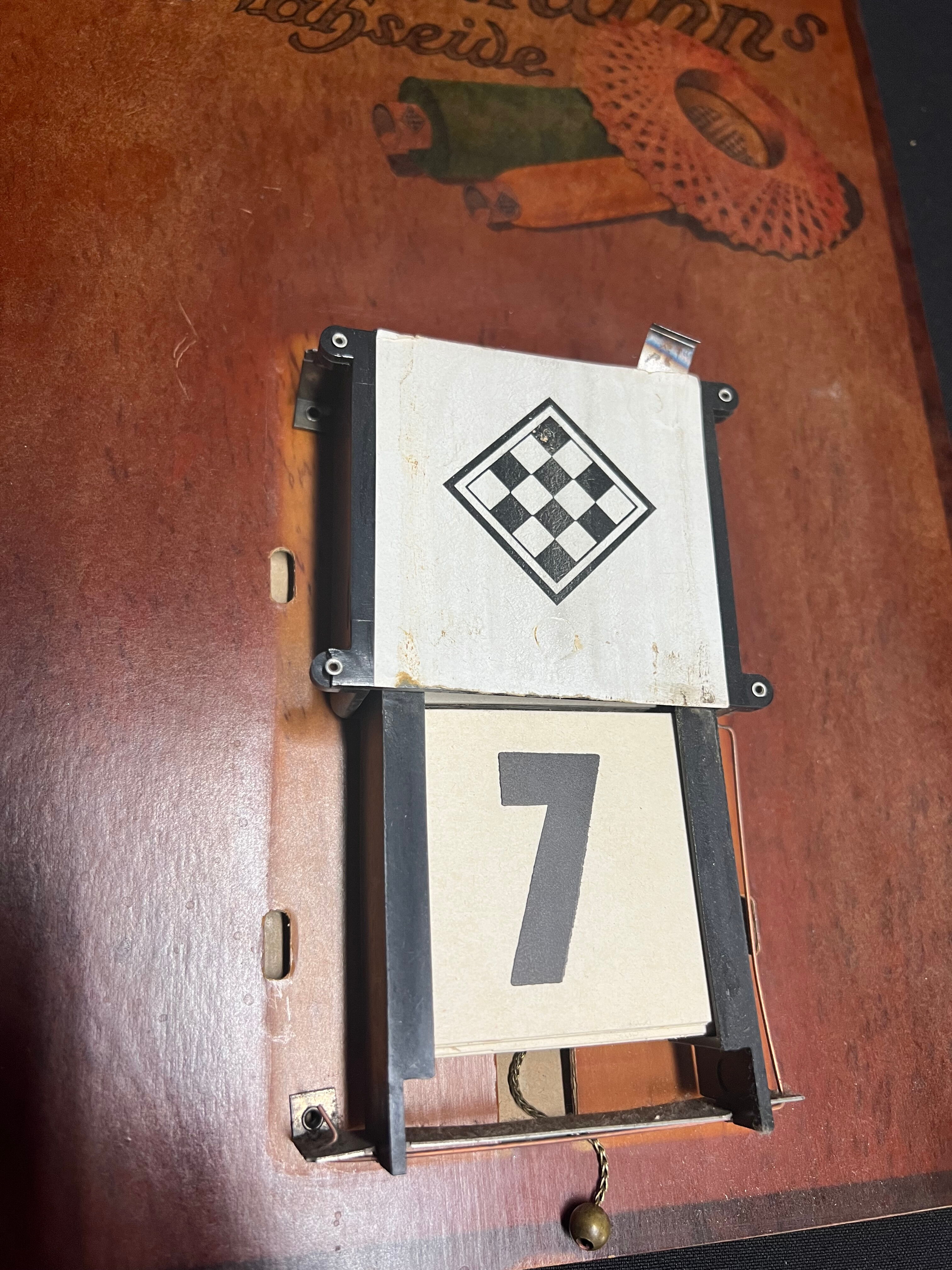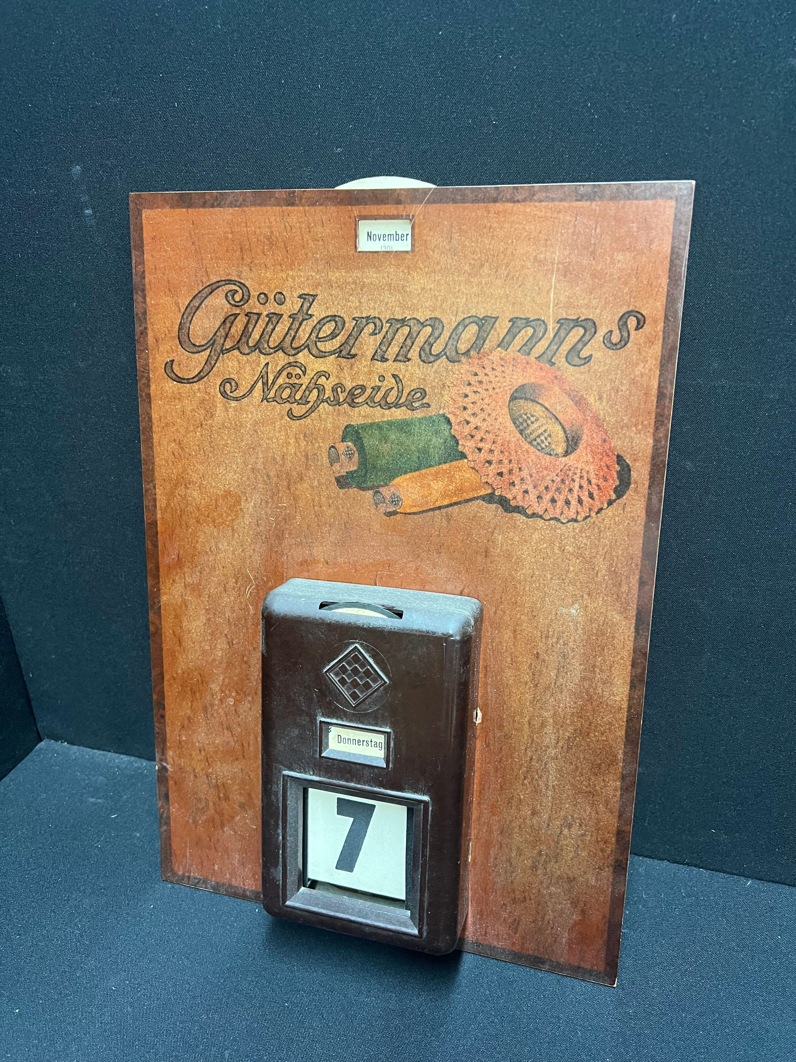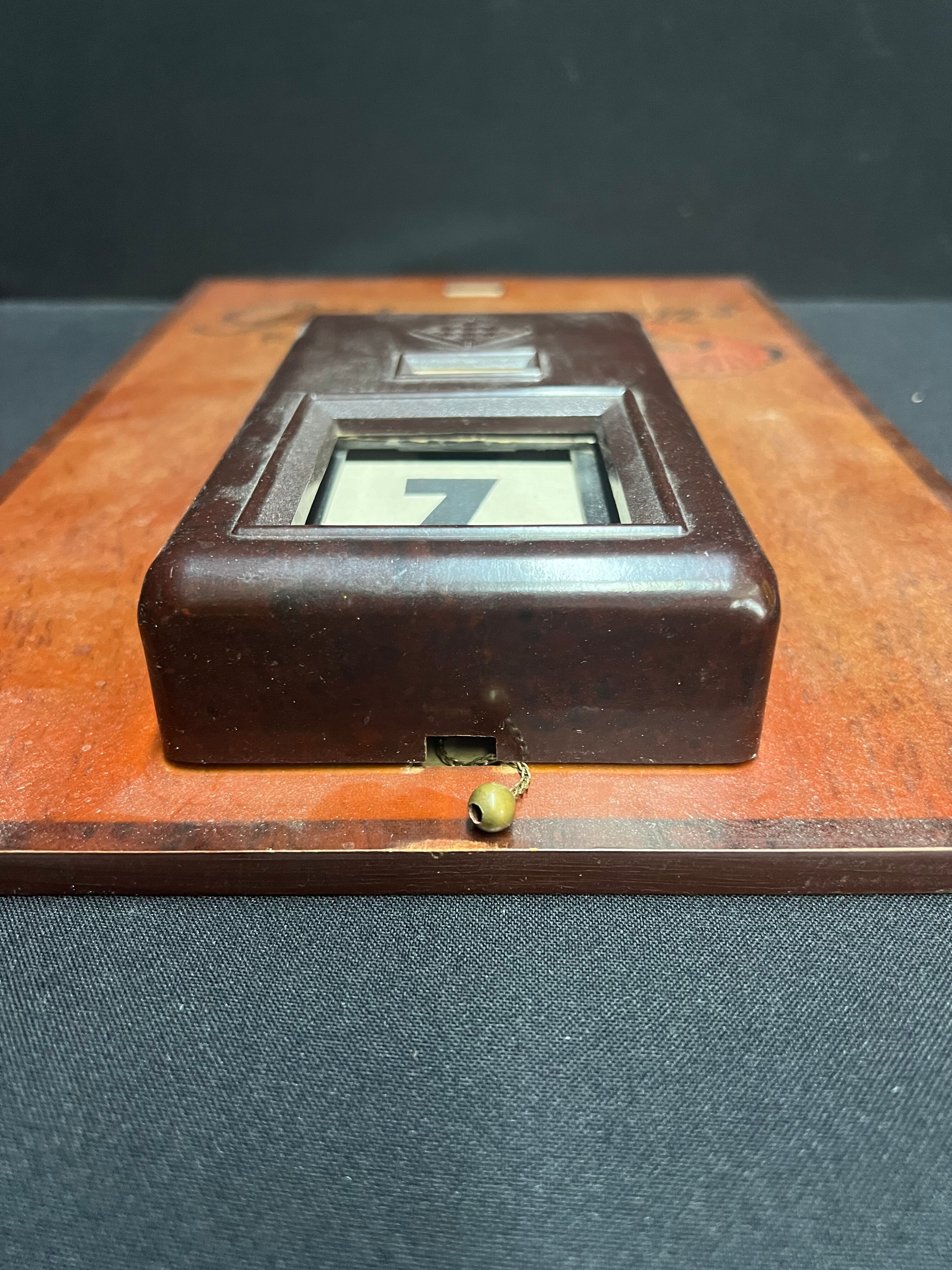 Unten eine Art Kasten mit Kette zum Ziehen und Bakelite Abdeckung. Diese kann mit vier kleinen “Riegeln” am Holzkorpus befestigt werden. Zwei “Riegel” leider abgebrochen. Dennoch kann man die Abdeckung befestigen. Mit einem kleinen Rad verstellt man unten die Wochentage. Mit einem Zug an der kleinen Kette springt der Kalender von Zahl zu Zahl. Ca. 38,5 x 26 cm