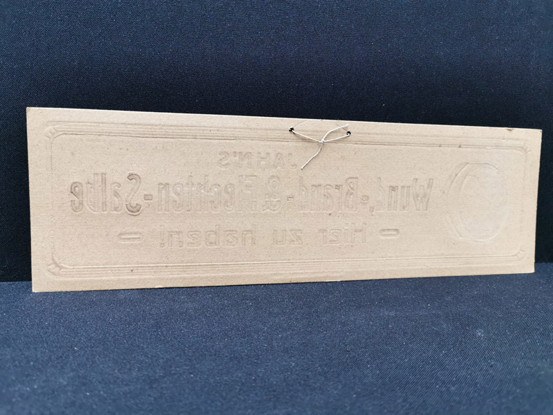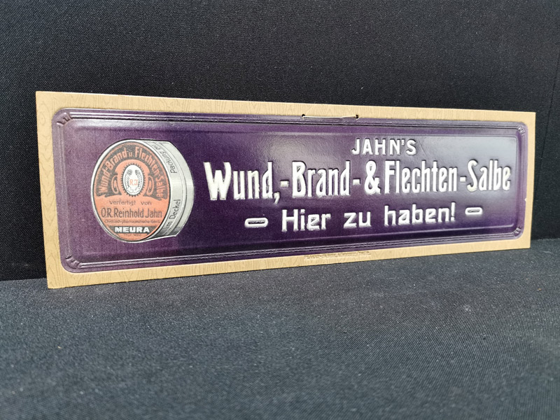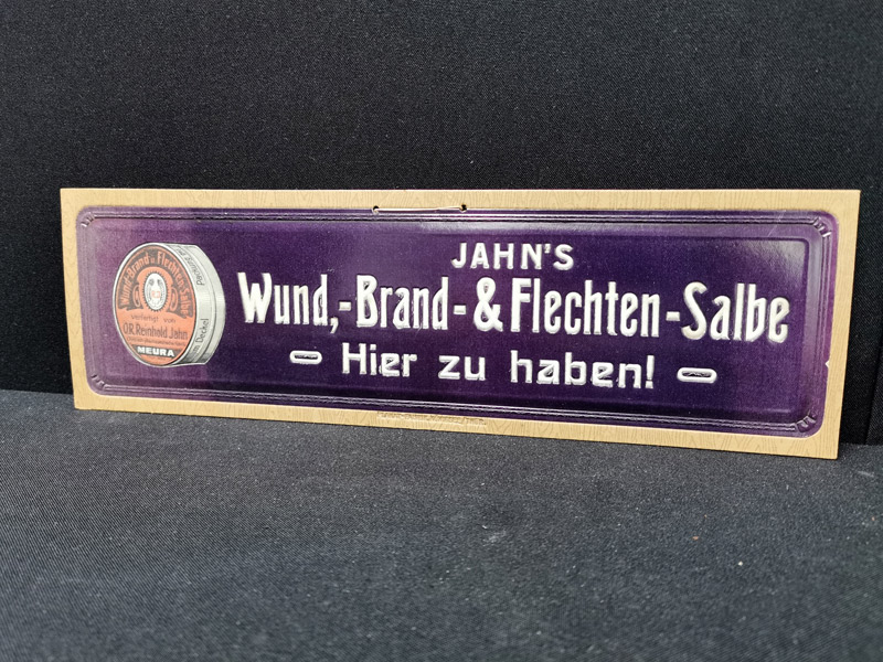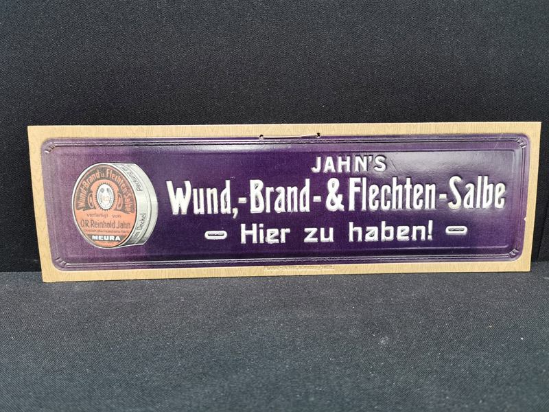 Sehr gut ehaltenes Schild in der unglaublich beliebten Farbe Lila. Pappe, geprägt und bedruck. Links neben der abgebildeten Dose nicht mehr ganz so farbintensiv wie im restlichen Teil. Könnte absichtlich so gemacht worden sein, um die Dose noch dreidimensionaler wirken zu lassen. Muss aber nicht! Ca. 10,5 x 34 cm. Tolle Badezimmerdeko.