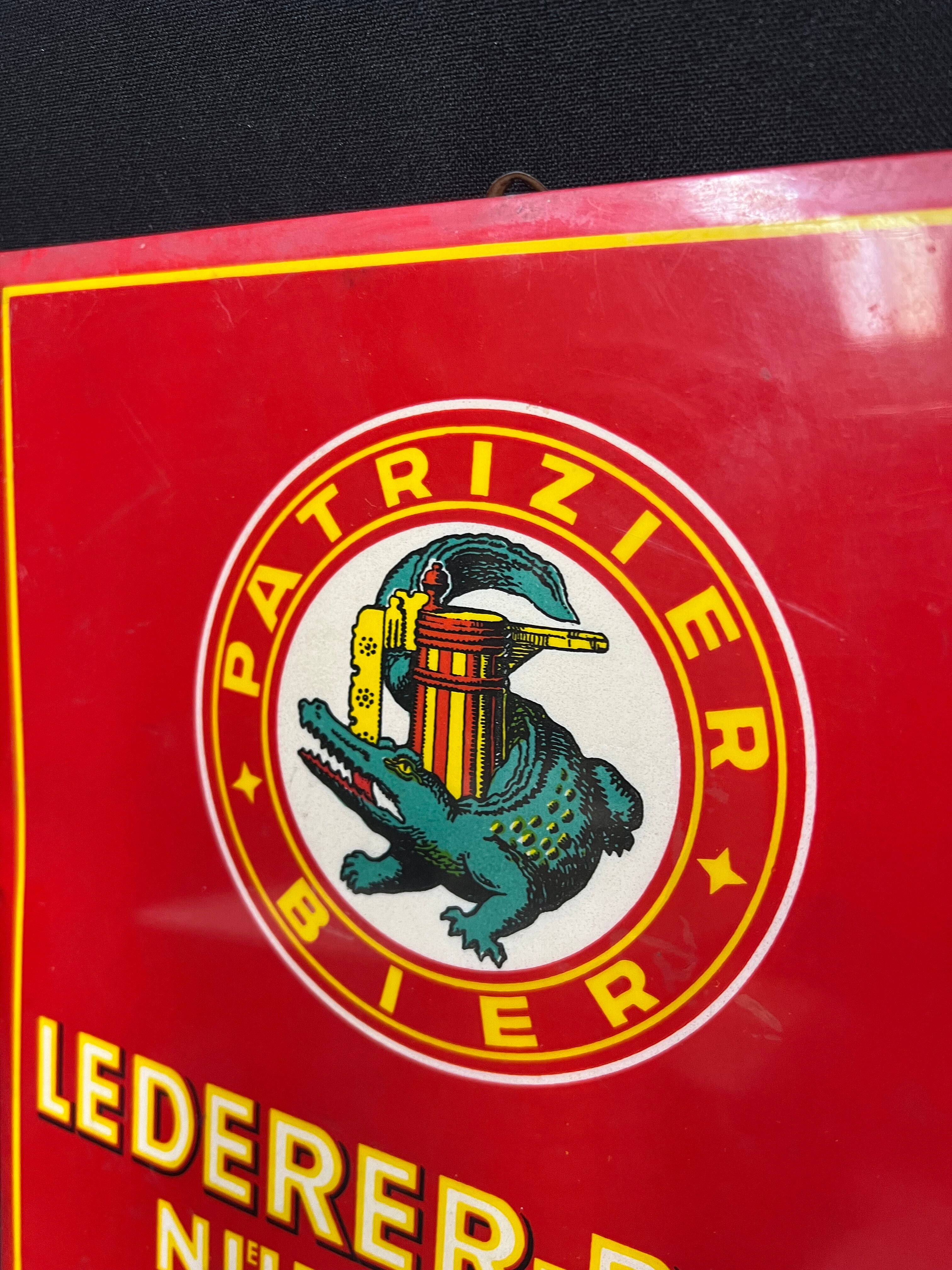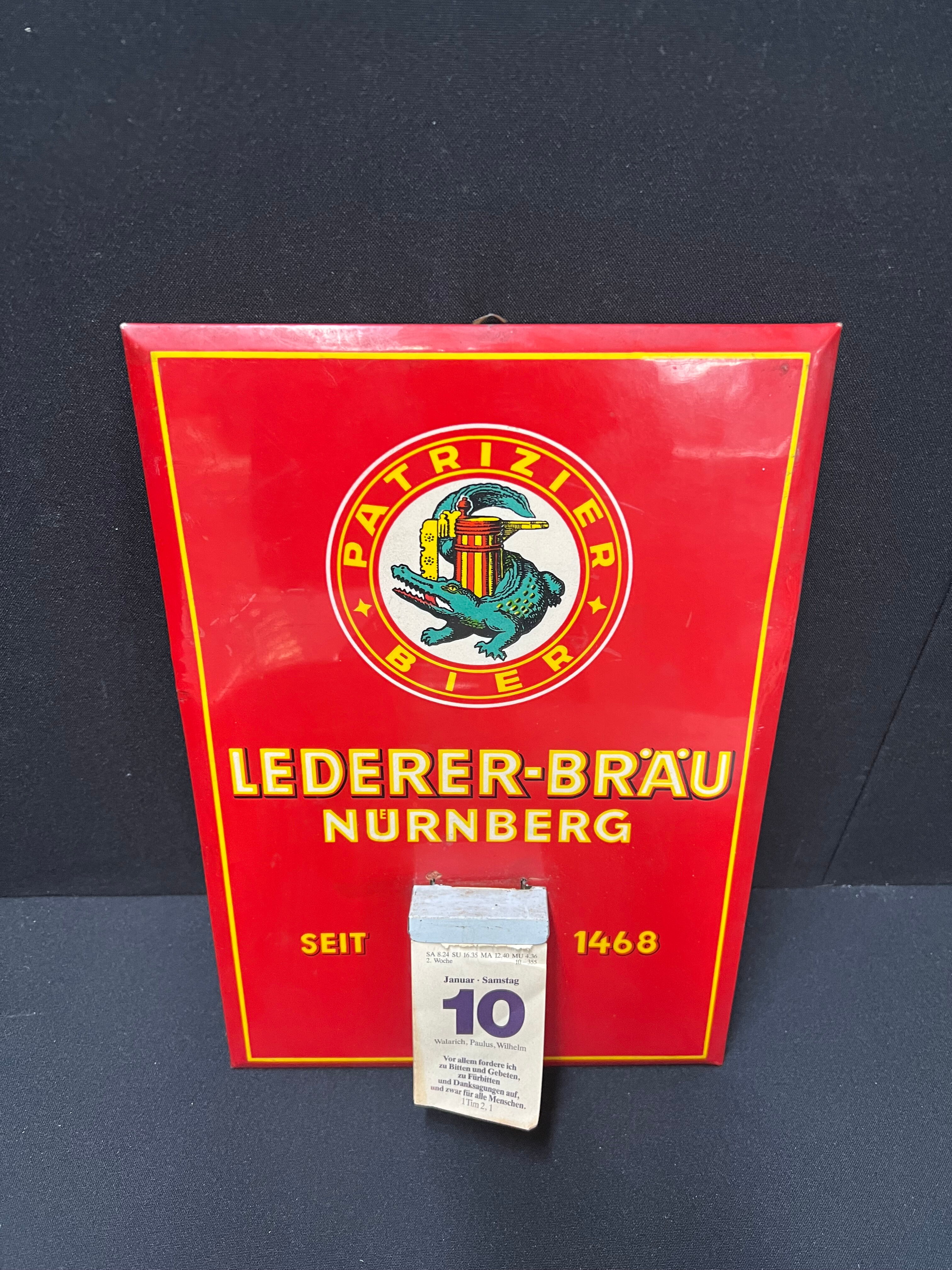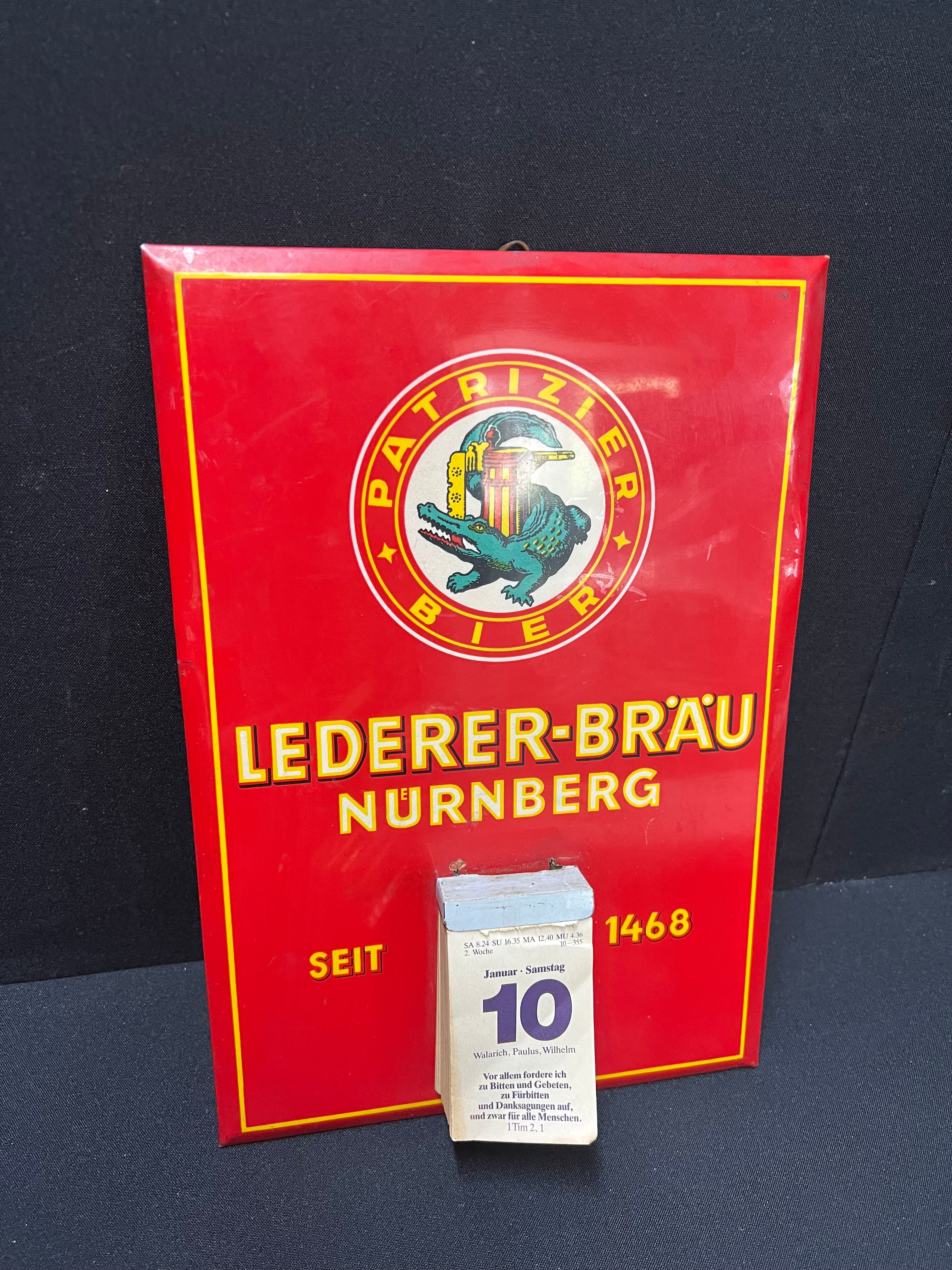 Blechkorpus. Ca. 34 x 23 cm. Schöner Erhaltungszustand. Beworben wird das Patrizier Bier der beliebten Brauerei mit dem Krokodil im Firmeneappen. Farbe ist gut, aber nicht perfekt. Oberfläche mit kleineren Druckspuren. Kalender startet mit dem 10. Januar. Kann natürlich jederzeit gegen einen aktuellen Kalender ausgetauscht werden. Um 1955.