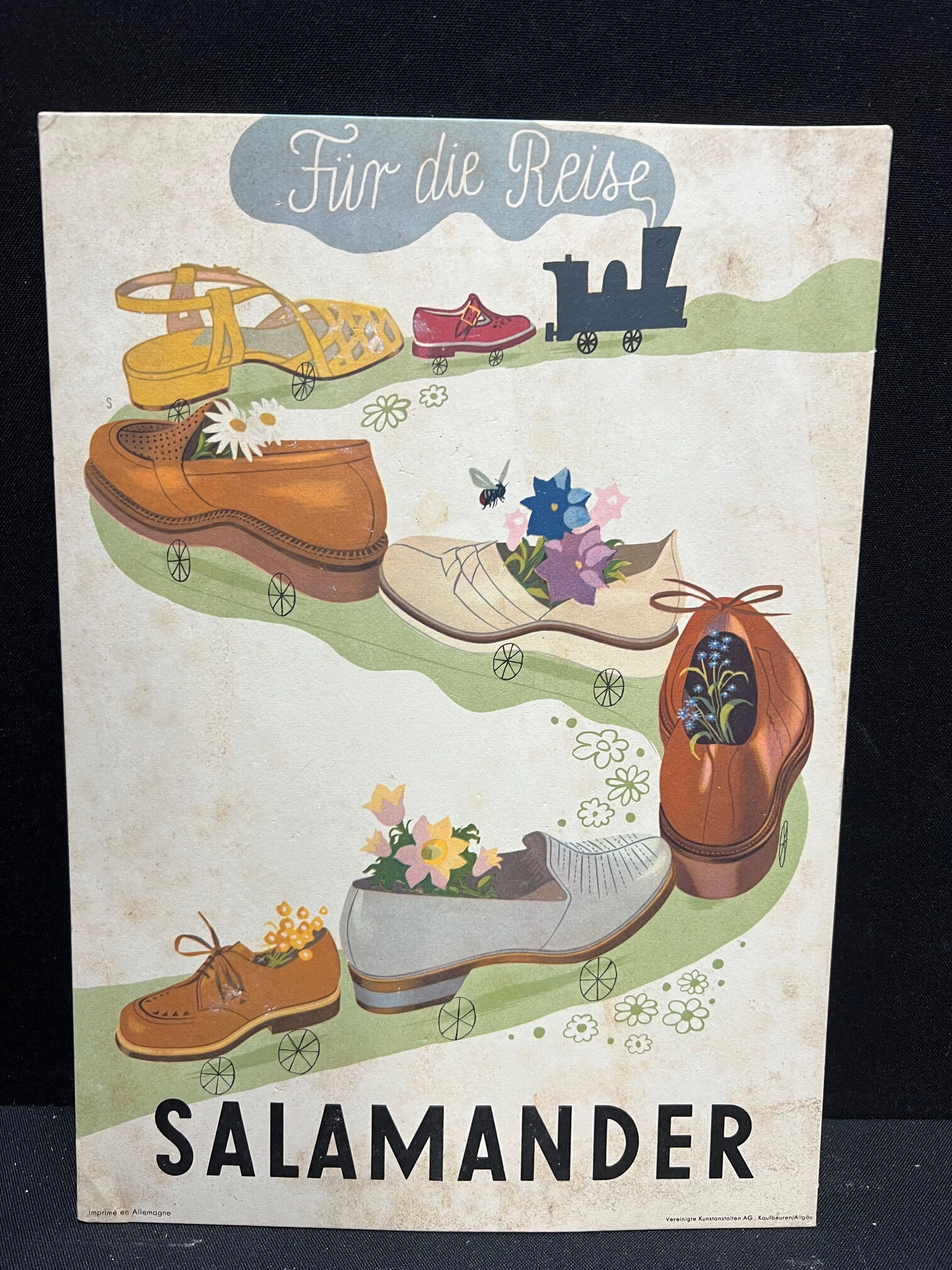 Über Umwege haben wir große Teile des privaten Archivs des österreichischen Kunstmalers und Werbegrafikers Professor Franz Weiss erwerben können. Seine Werke schafften es in unzählige Ausstellungen und eroberten sogar den Broadway. Franz Weiss lebte bis zu seinem Tod in Kempten (Allgäu). In den 50er Jahren schuf er unter anderem zahlreiche Reklameentwürfe für Weck, Rex, Hofbräu und Salamander. Aufgrund der zum Teil wirklich extremen Seltenheit und der traditionellen Motive vermuten wir, dass seine Werbung überwiegend im süddeutschen Raum eingesetzt wurden. Der hier angebotene Pappaufsteller war uns bislang gänzlich unbekannt. Pappe befindet sich in mittlerer Erhaltung. Leicht fleckig und oben vor Jahren wohl einmal feucht geworden.