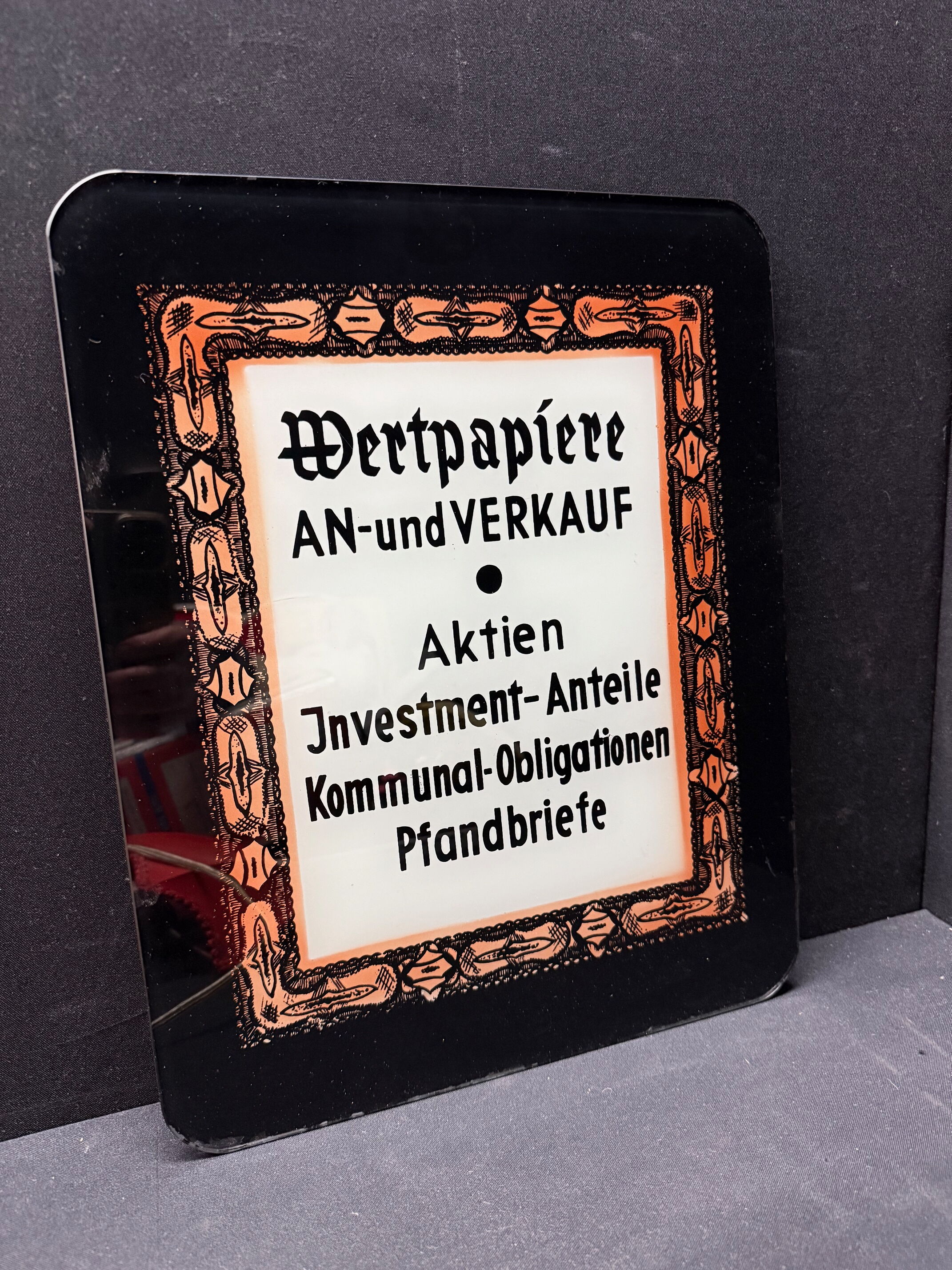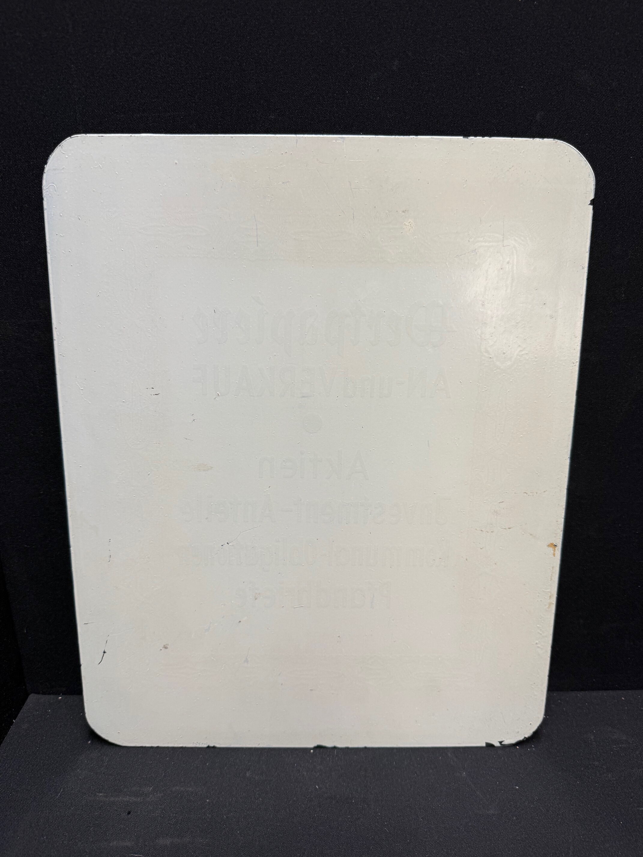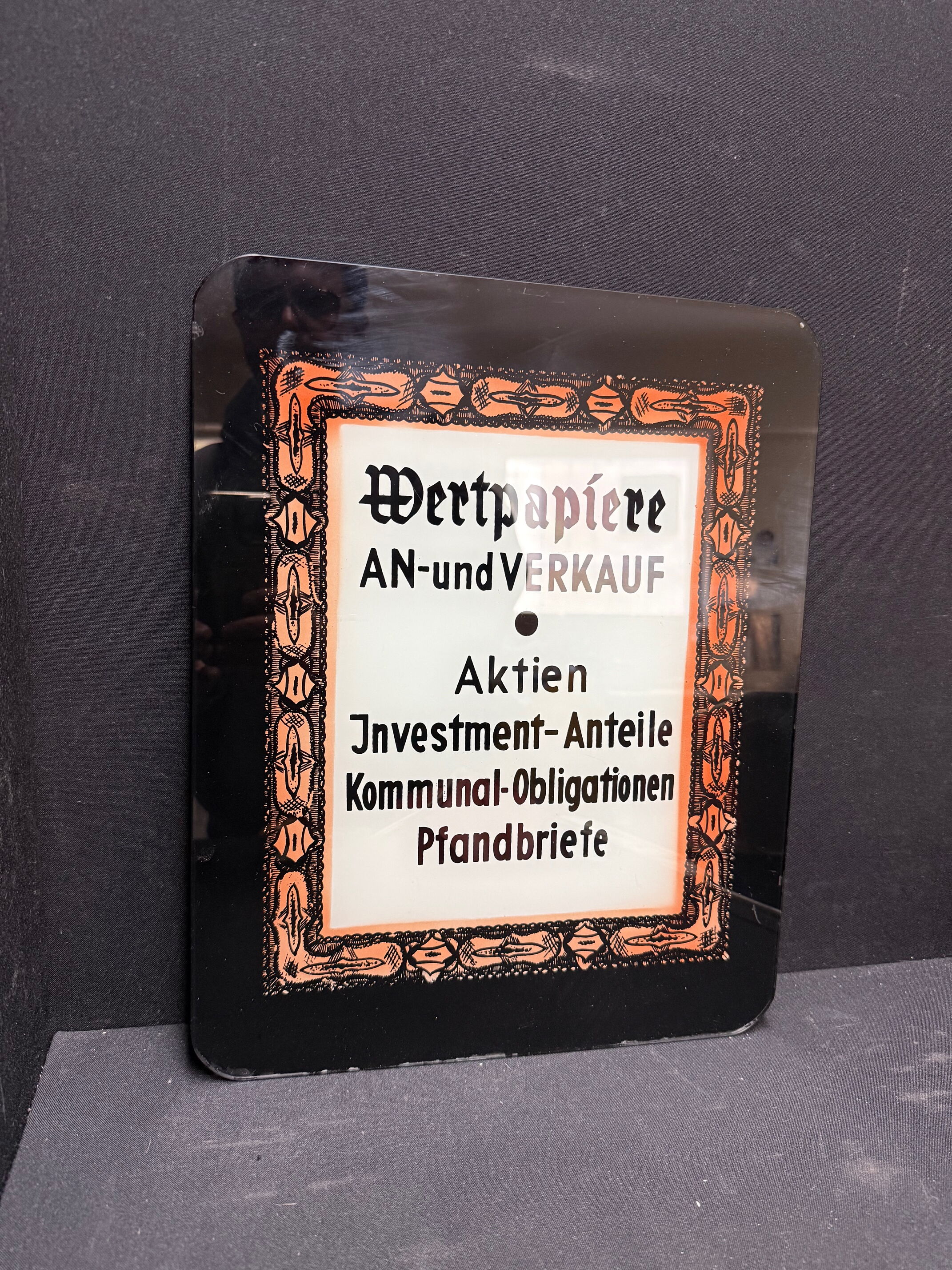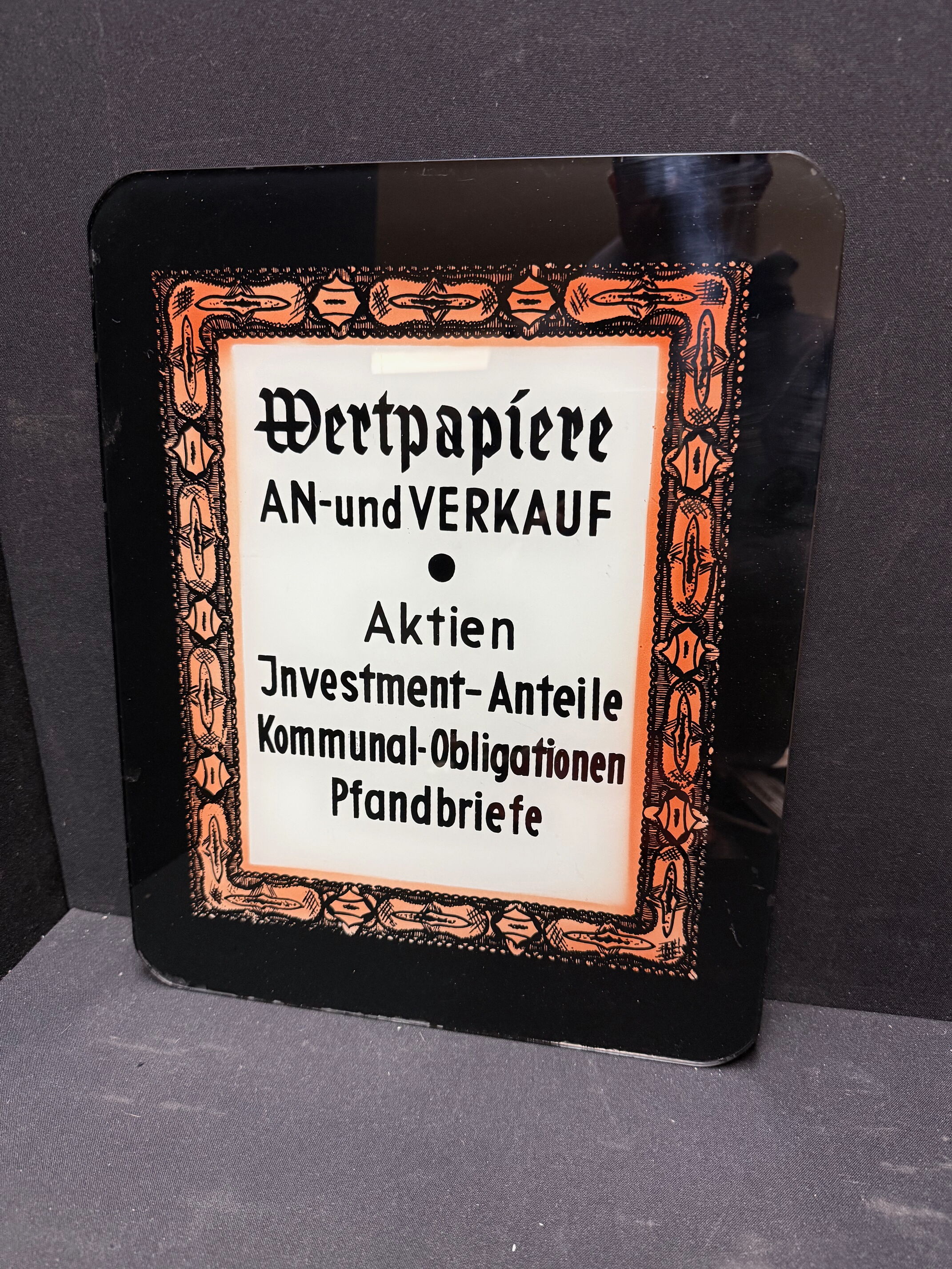 Schild hat keine Löcher. Könnte also vielleicht das Glas einer Werbeleuchte sein. Oder ein Aufsteller, dem über die Jahre die Aufstellfunktion abhanden gekommen ist.