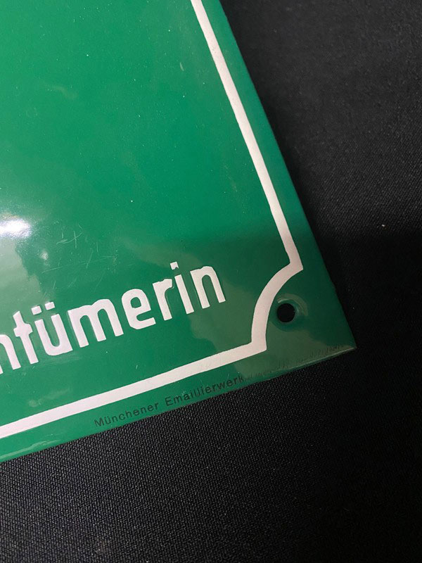 Wunderbar verarbeitetes Emailschild von den Münchener Emaillierwerken, dicke Oberfläche, Schrift teils zuckergussartig aufgetragen. Diese grüngrundigen Hinweisschilder heben sich in der Seltenheit deutlich ab von den einfachen " Betteln und Hausieren " Schildern in schwarz / weiss, die noch recht häufig zu finden sind aber auf Auktionen inzwischen schon stattliche Preise erzielen. Nahezu perfekter Zustand, 2 winzige Randchips, Oberfläche einfach genial. Größe: 40 x 32 cm