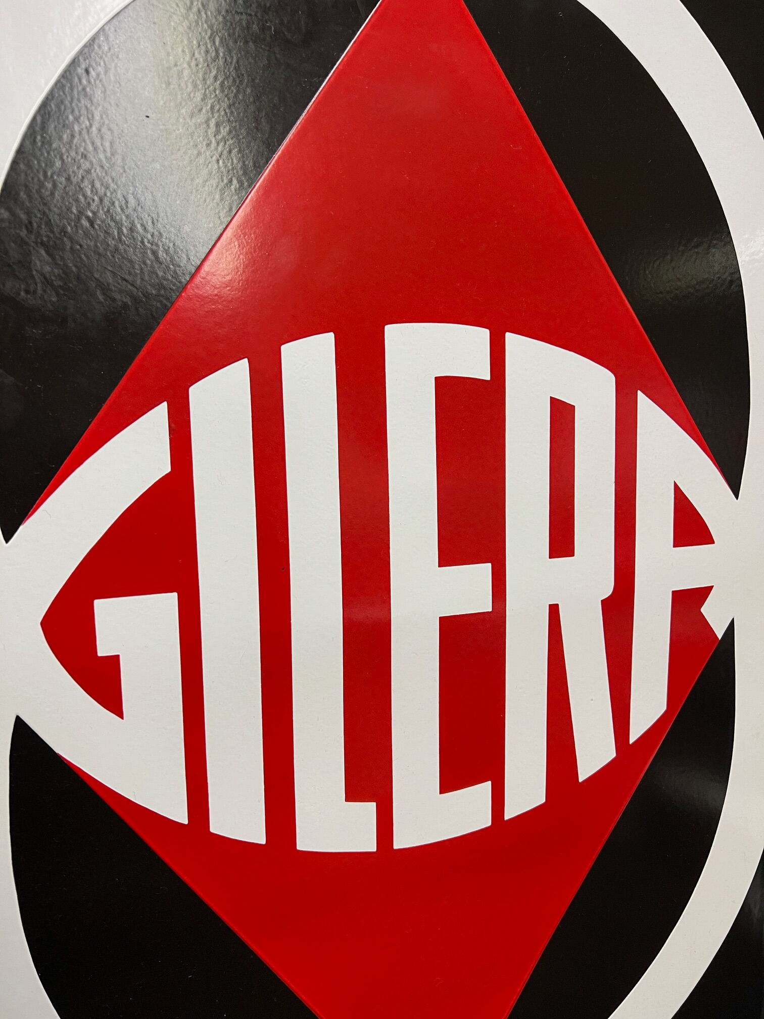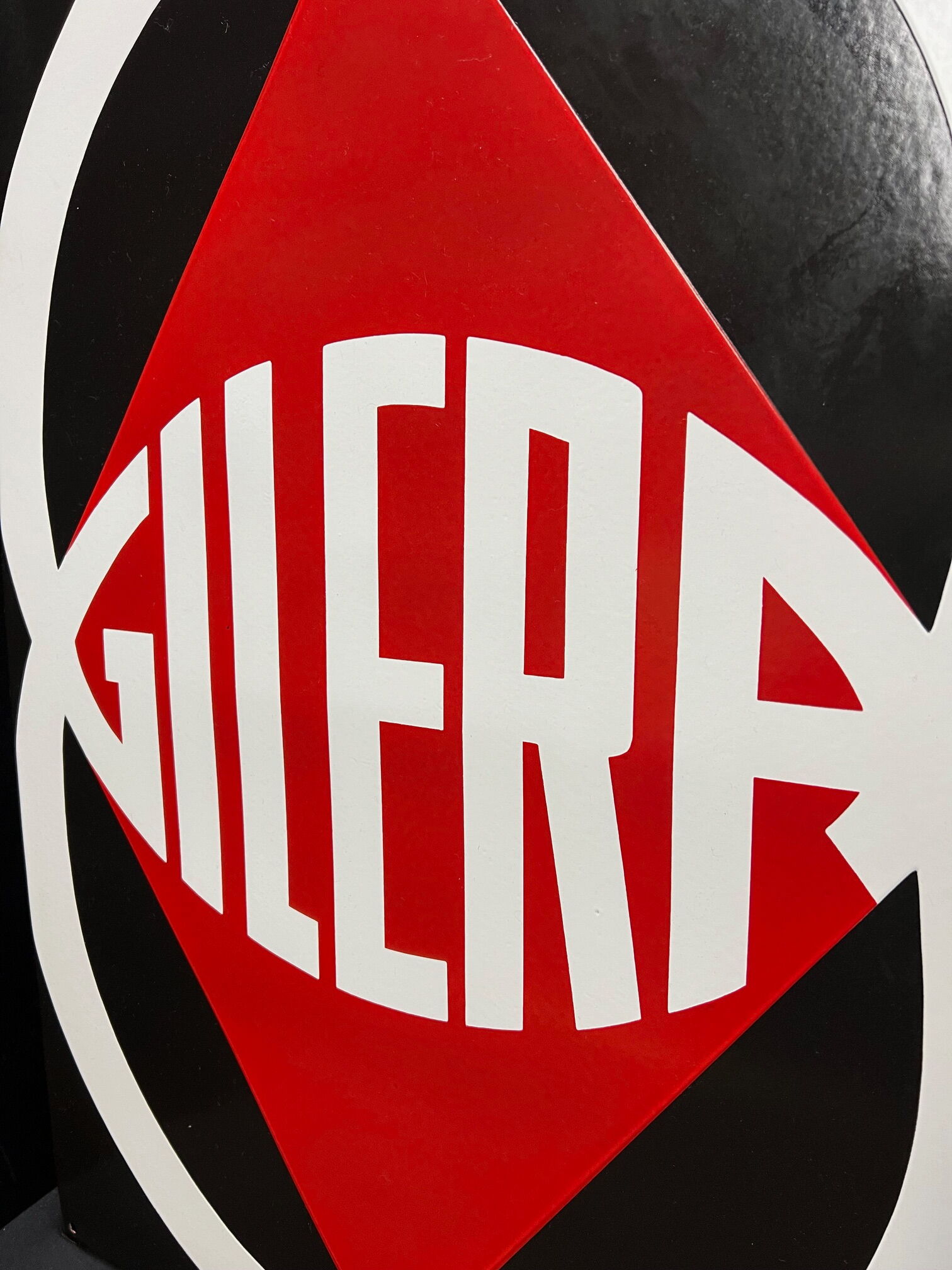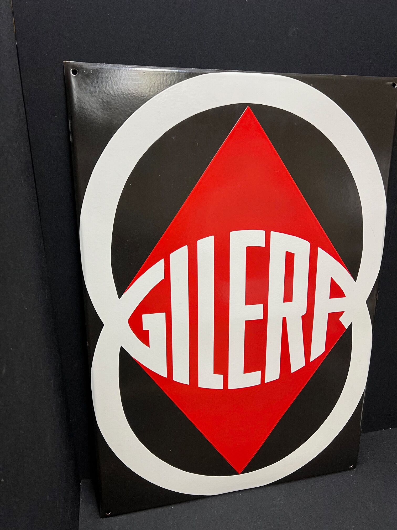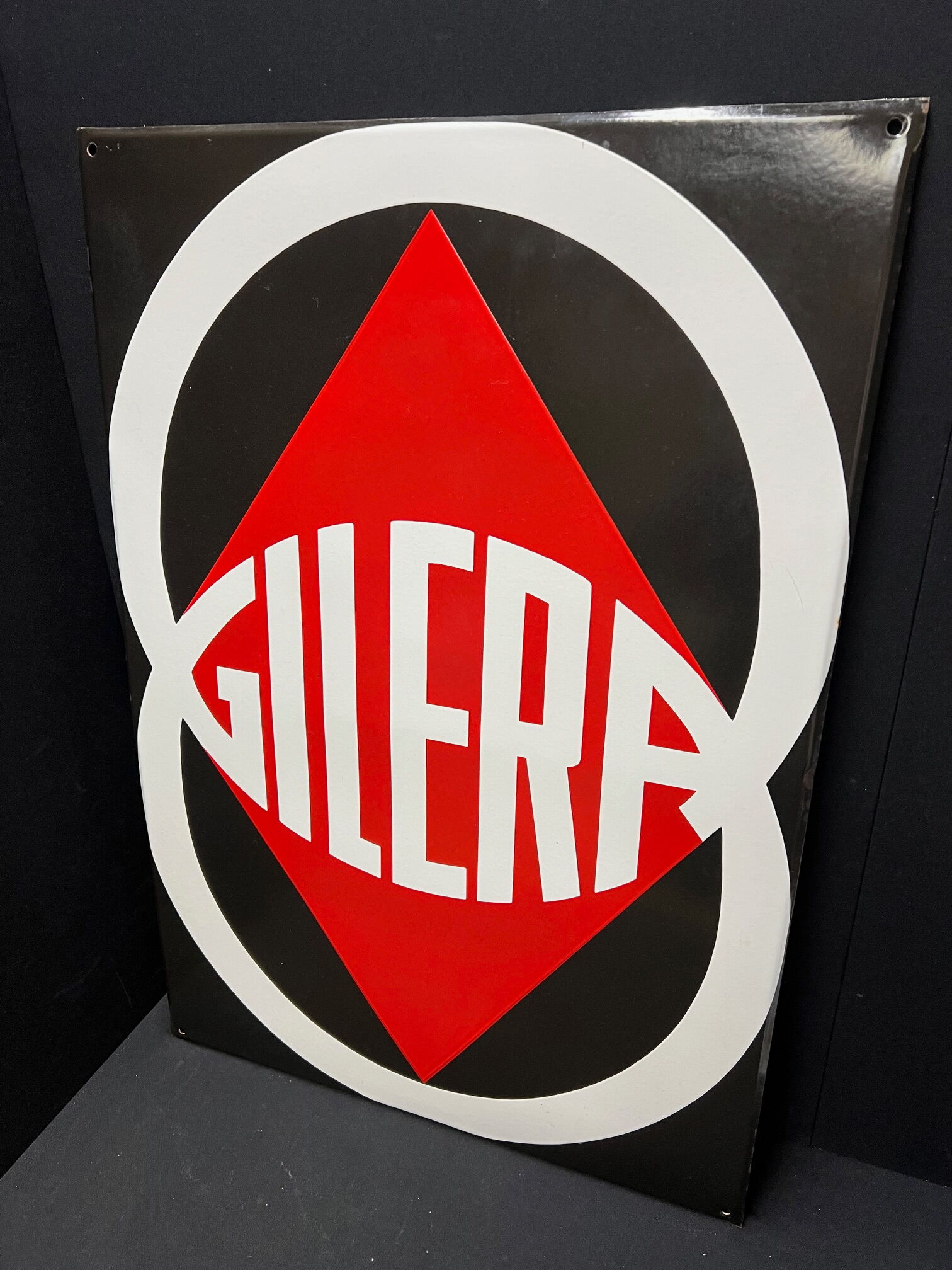 Grafisch beeindruckendes und größenmässig imposantes Emailleschild. Flach und schräg abgekantet. Gilera ist einer der ältesten italienischen Motorradhersteller und eine Tochterfirma des Piaggio-Konzerns. Gilera verbaute als erster Hersteller querliegende Vierzylindermotoren.