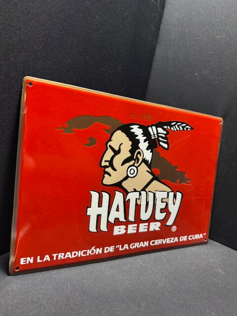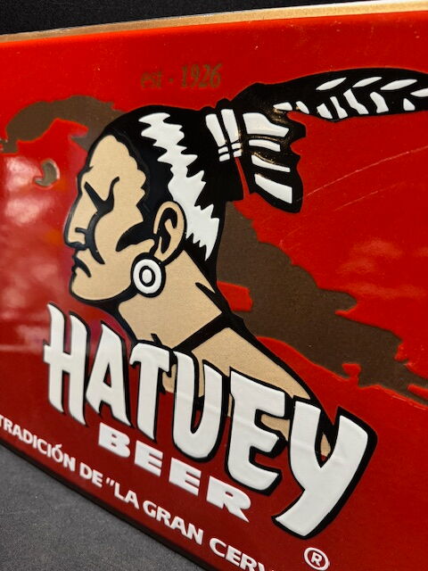 Abgekantetes Emailschild schabloniert, Frankreich um 1960, 52 x 36 cm, JMB Paris. Super Zustand. Ganz leichte Kratzspuren an 2 Stellen,richtig gute Oberfläche. Die Hatuey Indianer des 16. Jahrhunderts galten als die ersten Widerstandskämpfer Kubas, seit 1927 dienen sie als Namensgeber der zu Bacardi gehörenden Brauerei.