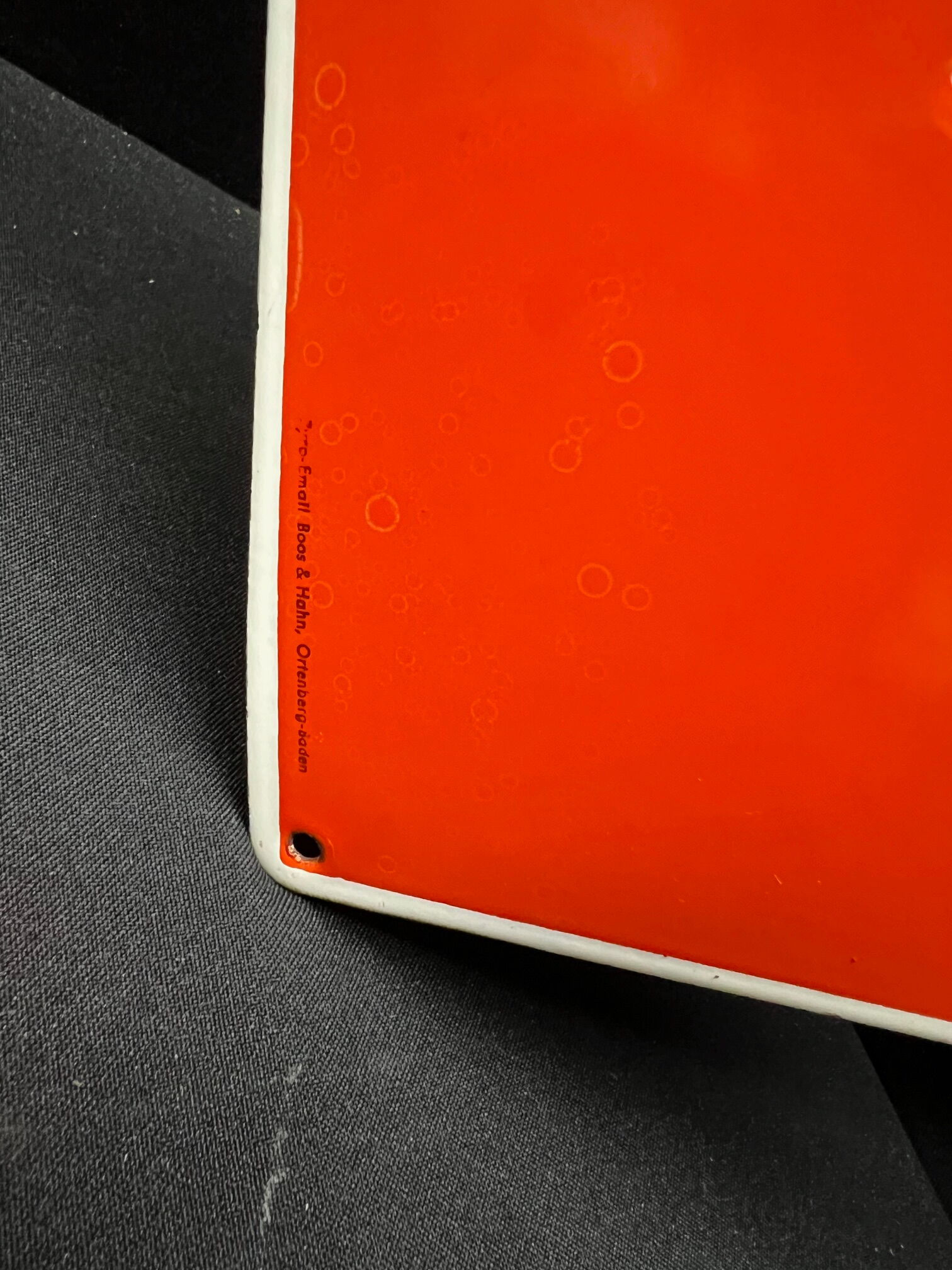 Tolles kleines, gewölbtes Schild von Boos und Hahn. Sehr gut in Glanz und Farbe. Keinerlei Eckbeschädigungen. Wirklich sehr schön. Ca. 32 x 32 cm.