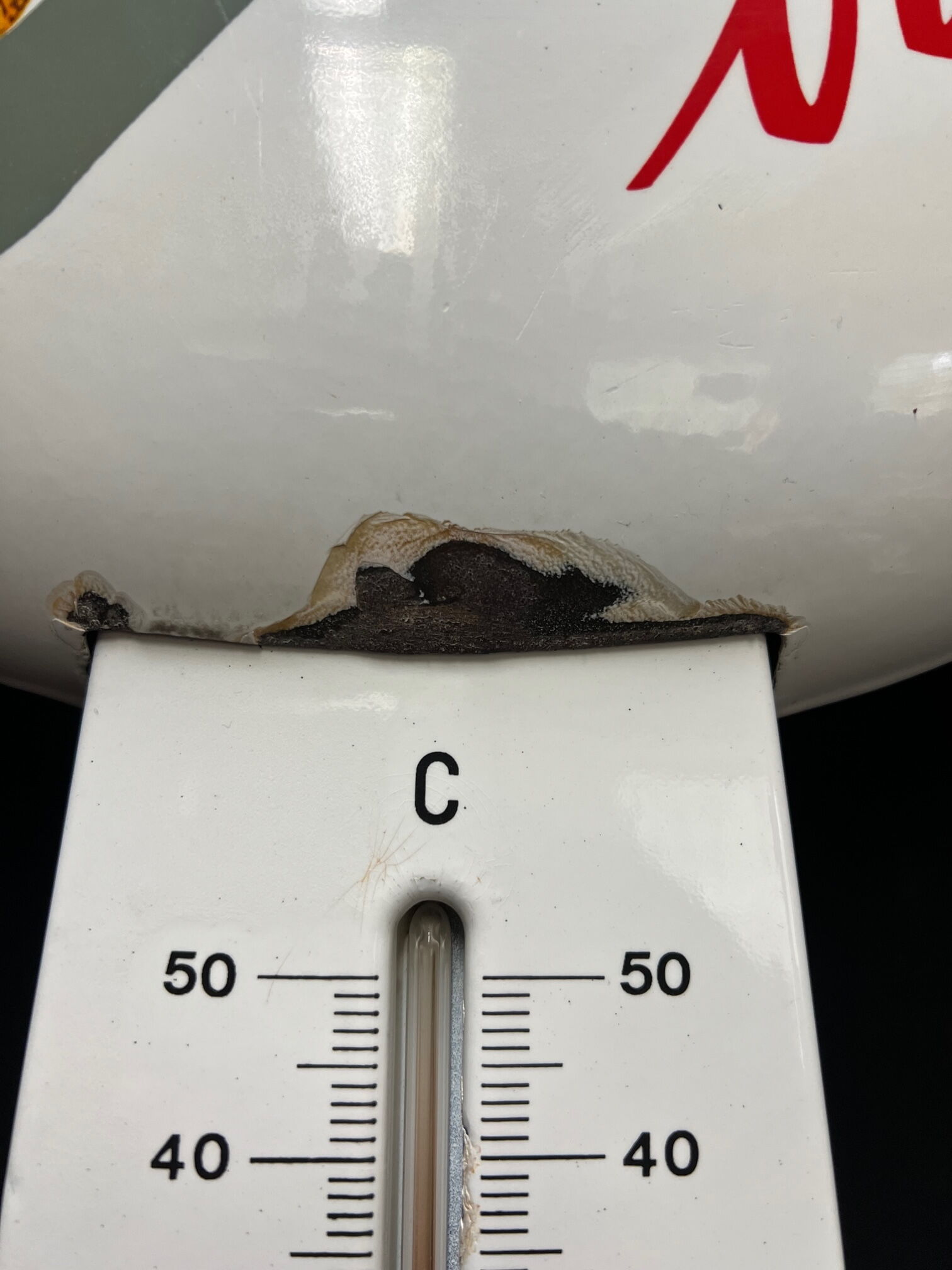 Glanz und Farben sind sehr, sehr gut. Einzig eine kleine Beschädigung am Ansatz des Thermometers verhindert einen Bestzustand. Ca. 66 x 40 cm. Thermometer sollte funktionieren.
