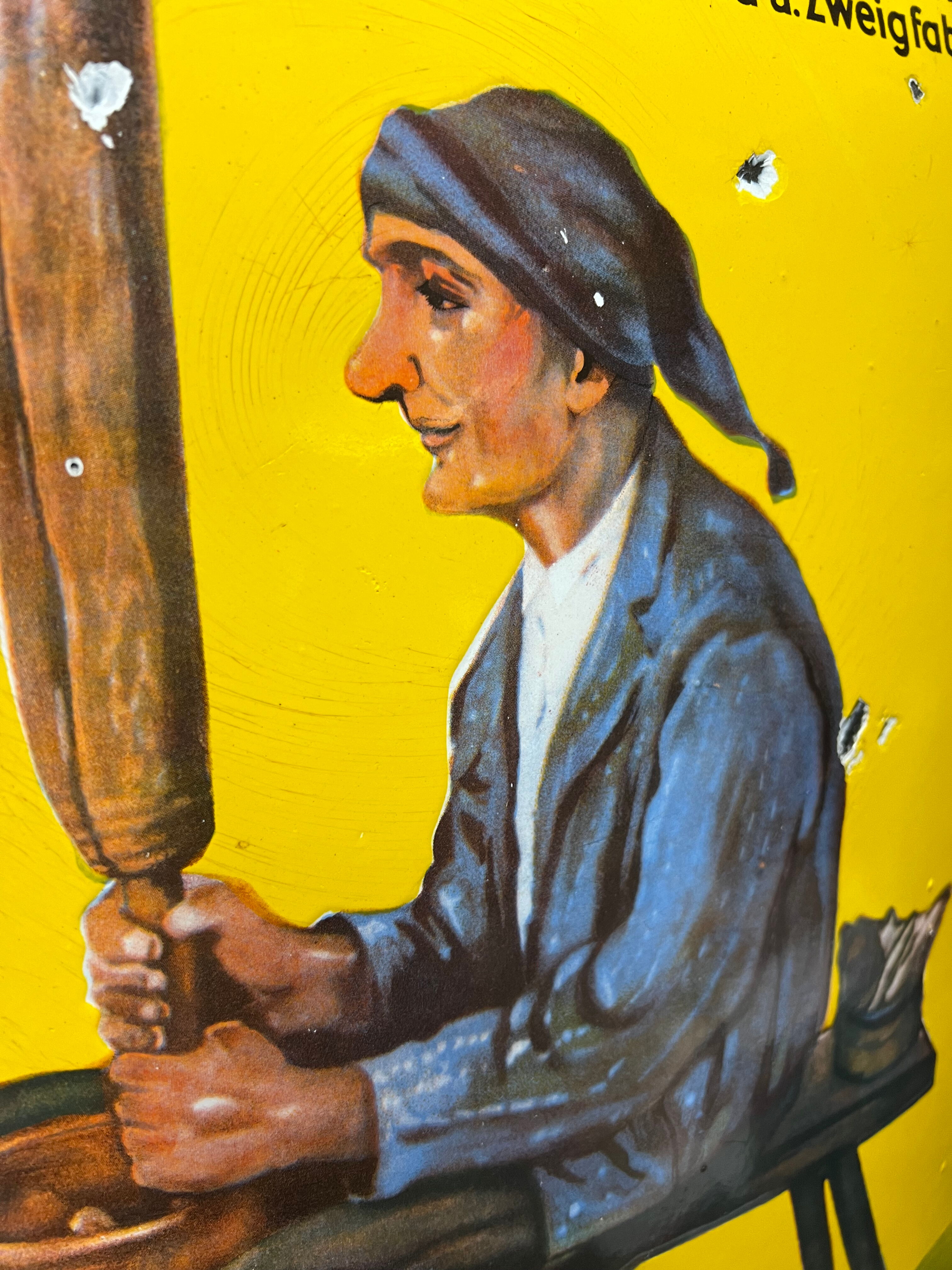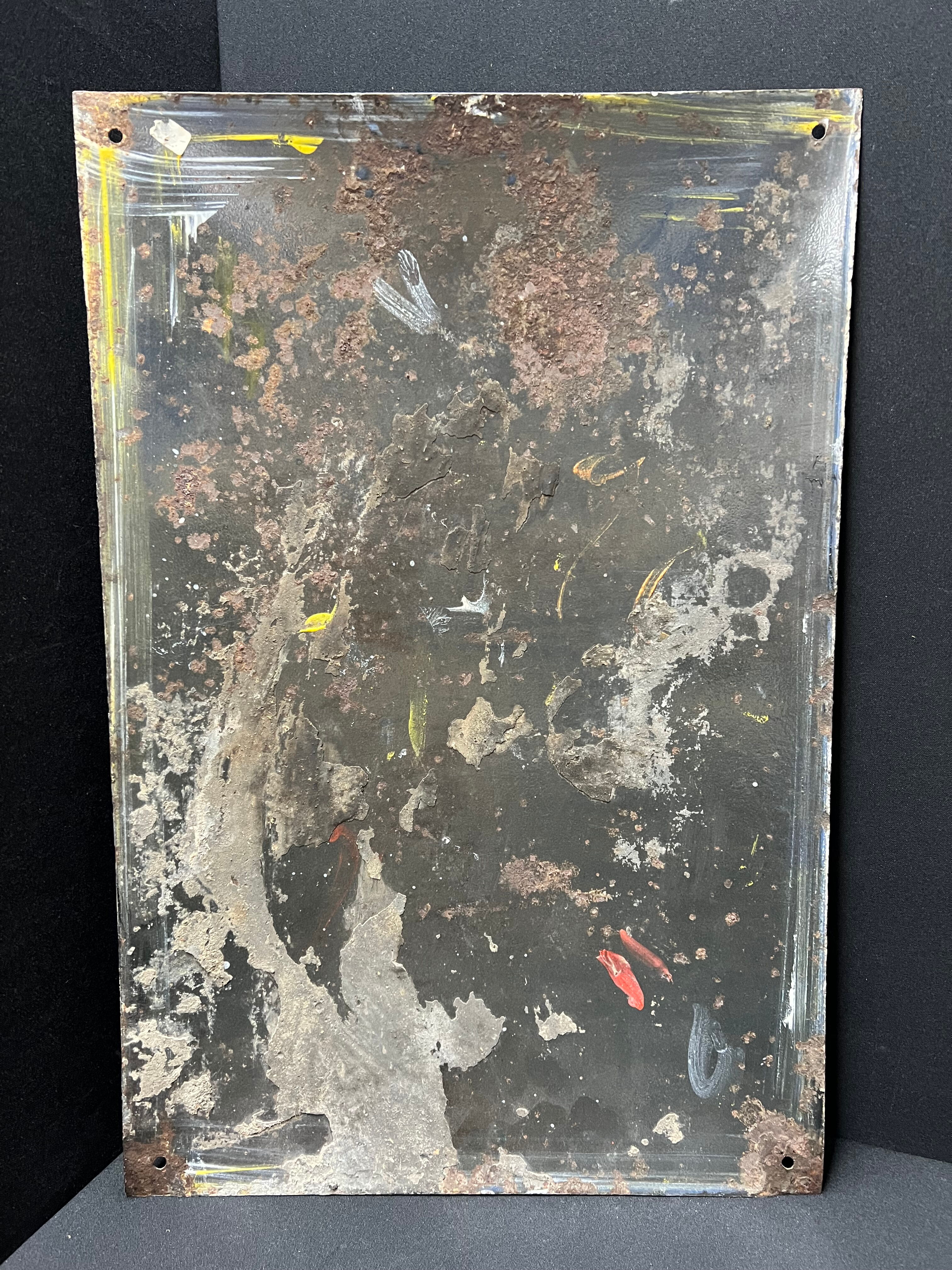 Wir denken, dass man zu diesem Schild trotz der Mängel hier und da, dennoch „gut“ sagen kann. Grund hierfür ist der tolle Glanz und die fantastischen Farben. Beschädigungen sind auf den Bildern gut zu erkennen. Ca. 60 x 40 cm.