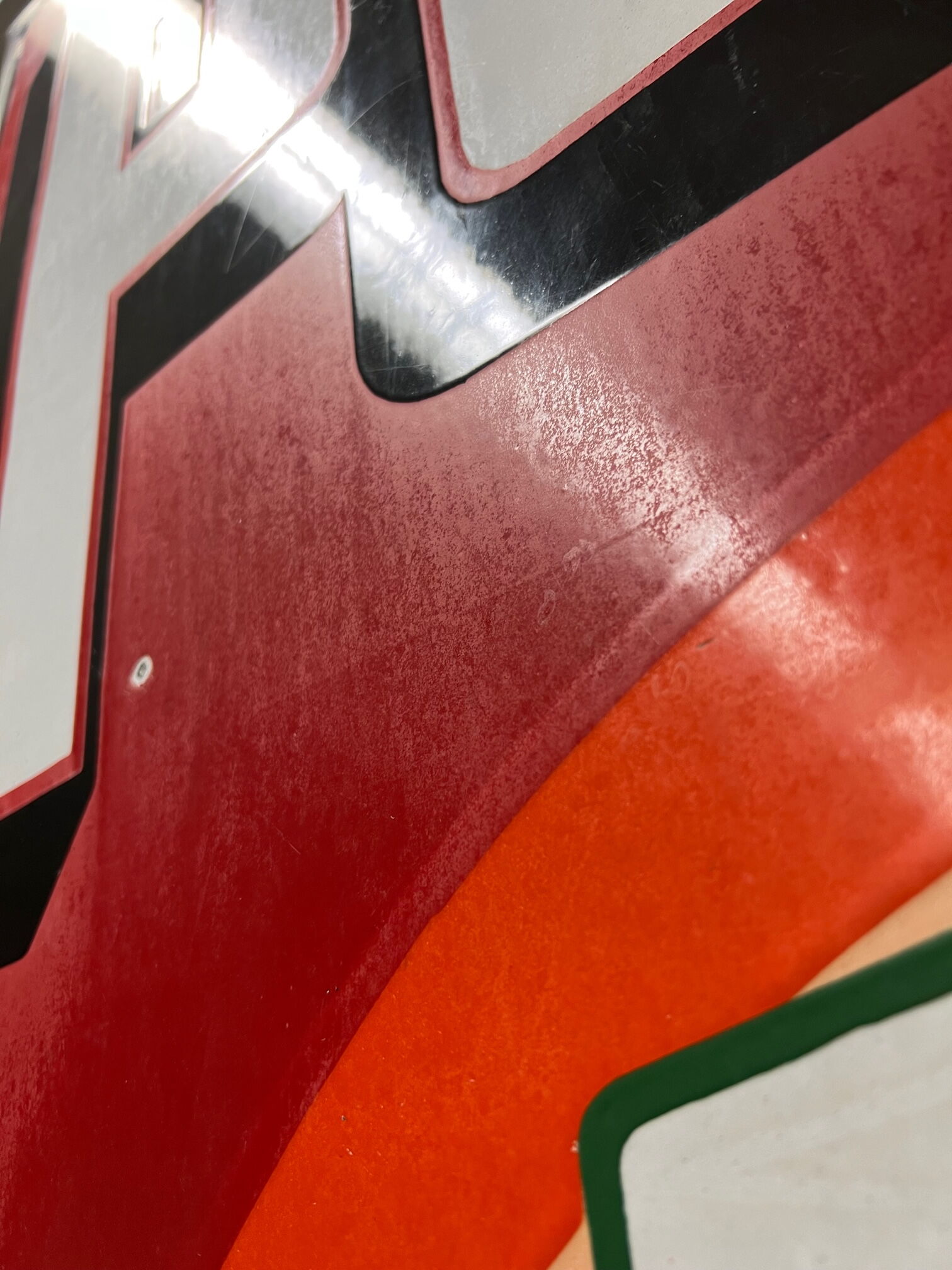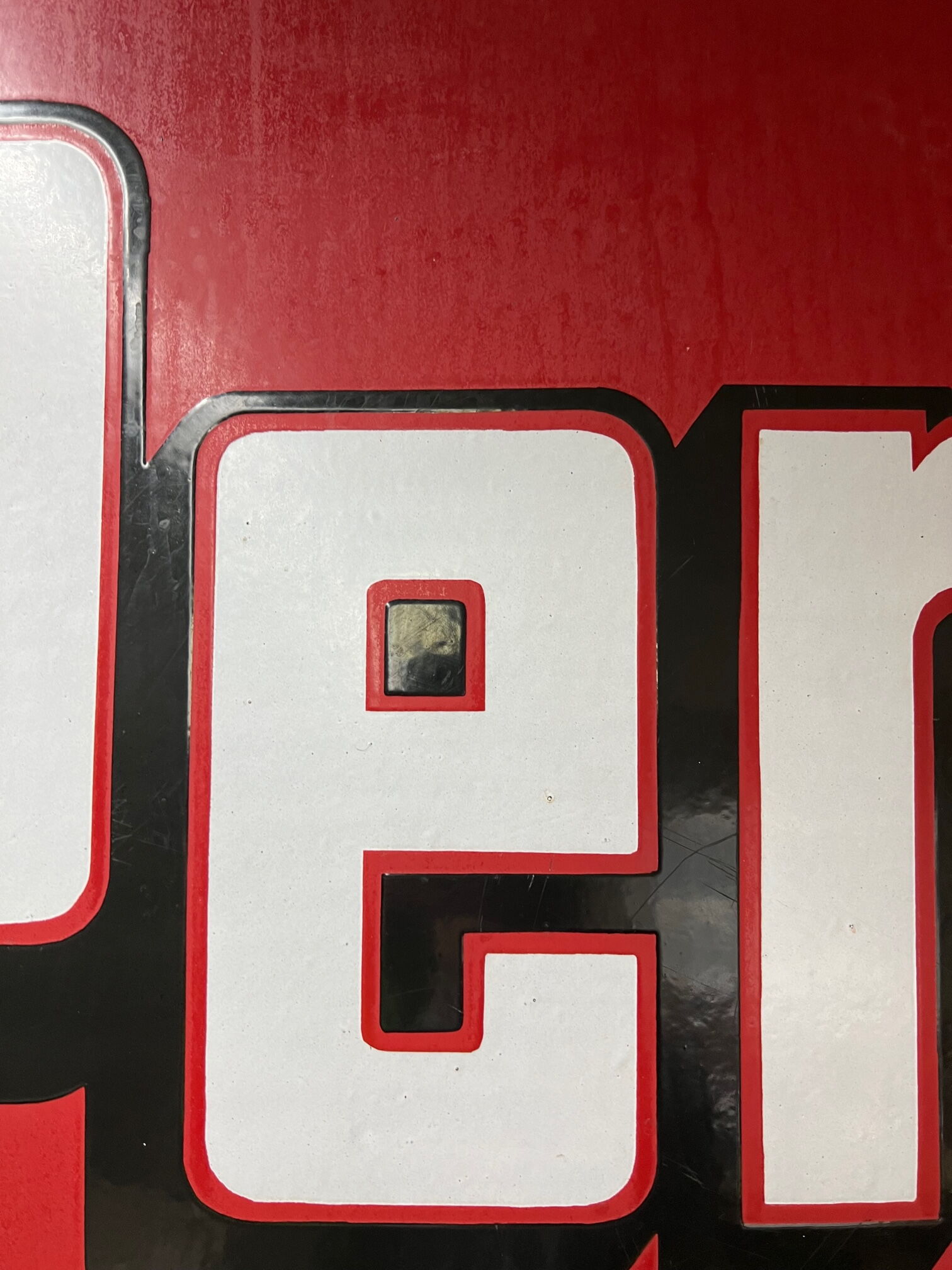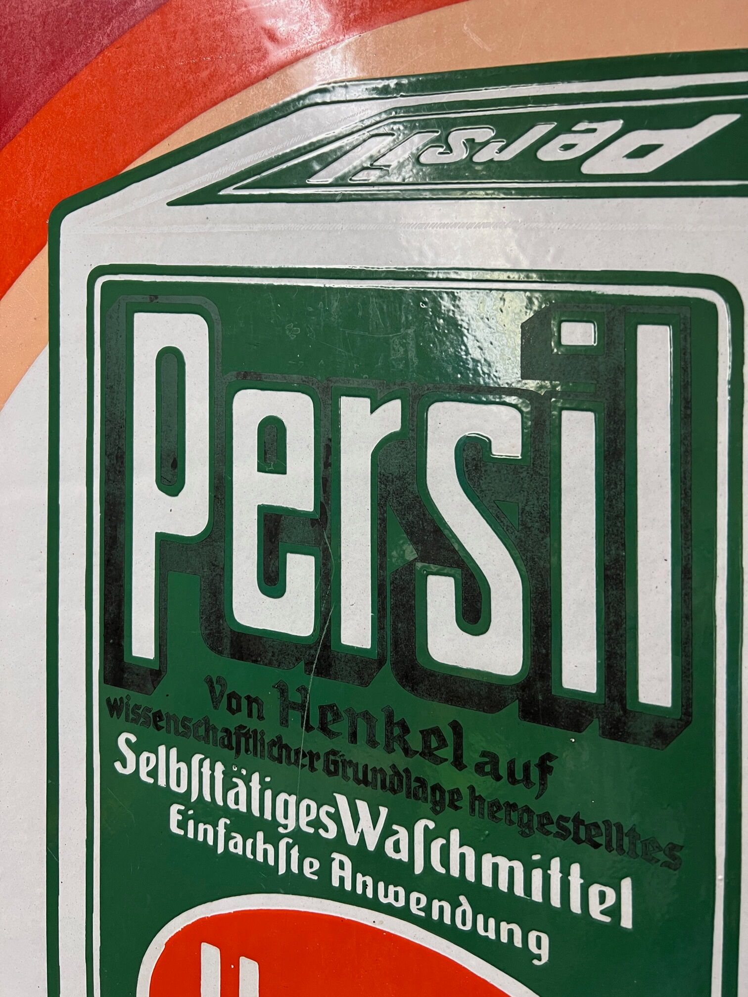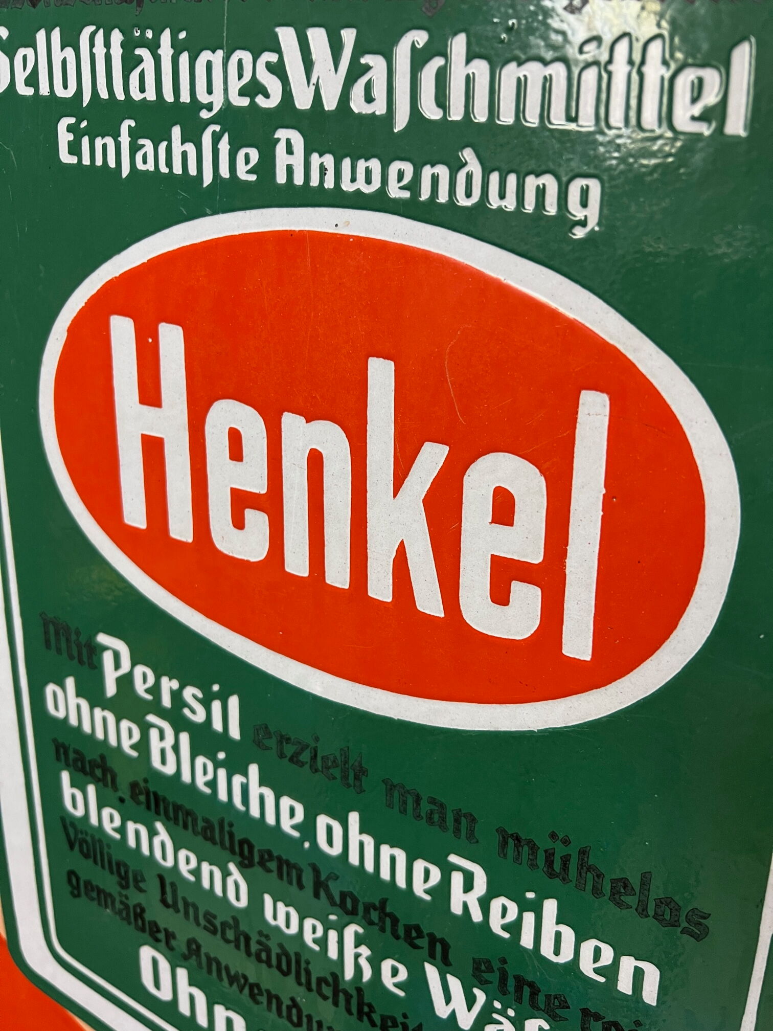 Emailschild in imposantem Großformat. Abgekantet. Schabloniert und lithographiert. Düsseldorf 20er Jahre. Ca. 117 x 77 cm. Gemarkt: Henkel & Cie., A.-G. Düsseldorf. Viel dekorativer kann ein Schild nicht mehr sein. Die Farben in Kombination mit dieser unfassbar imposanten Größe, lassen einem das Herz einfach höher schlagen. Im unteren Bereich des Schildes ist die Oberfläche noch sehr schön. Glanz und Farben eh. Oben allerdings hat die Oberfläche förmlich Schlieren. Diese sieht man hauptsächlich bei seitlicher Betrachtung. In einem oder zwei der Detailbilder haben wir versucht dies gut sichtbar zu machen. Restliche Mängel sollten auf den Fotos gut zu erkennen sein. Schild ist ungewöhnlich wenig verzogen. Das Schwarz im Päckchen selbst mit deutlichem Abrieb. Sonst prima. Zustandsmäßig natürlich nicht perfekt. Dennoch kommt dieses Schild selten so gut daher.