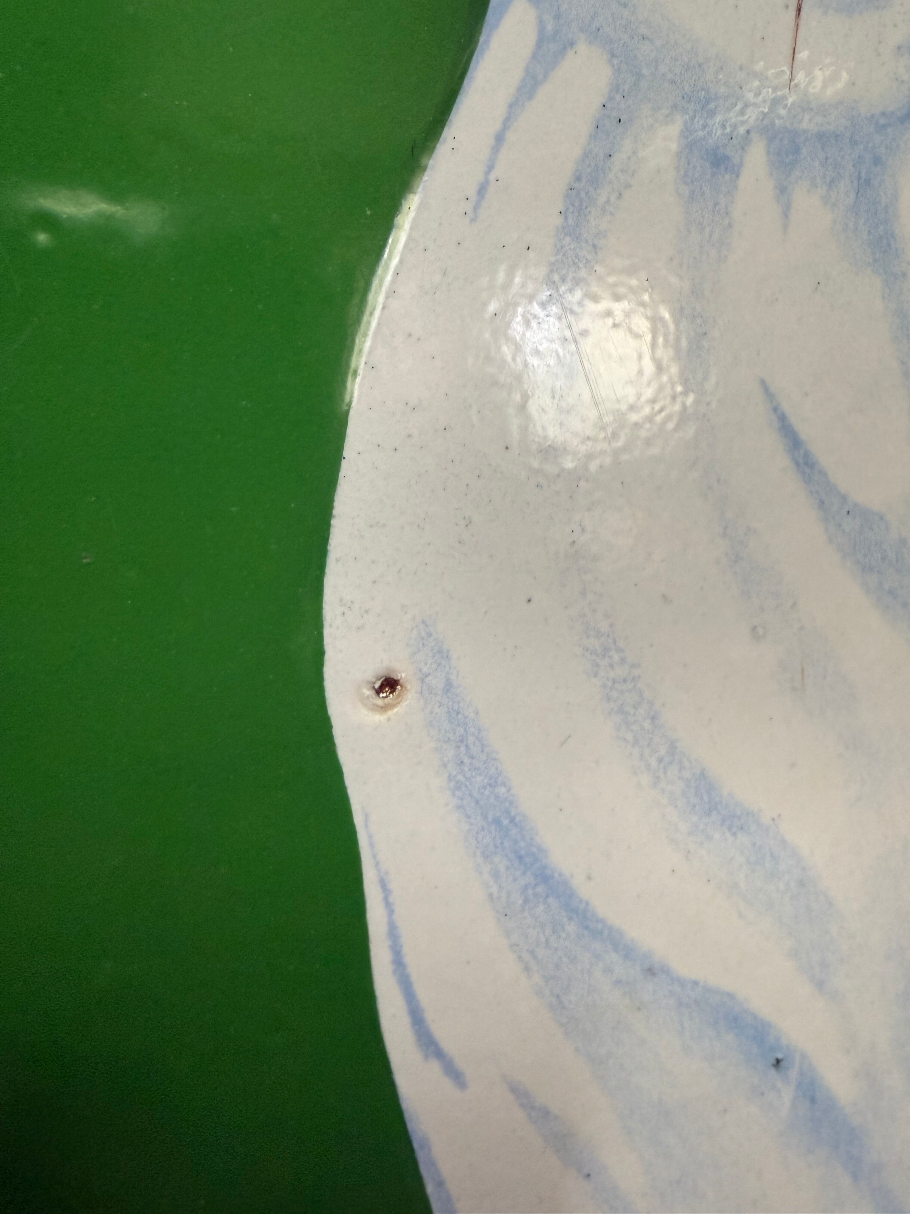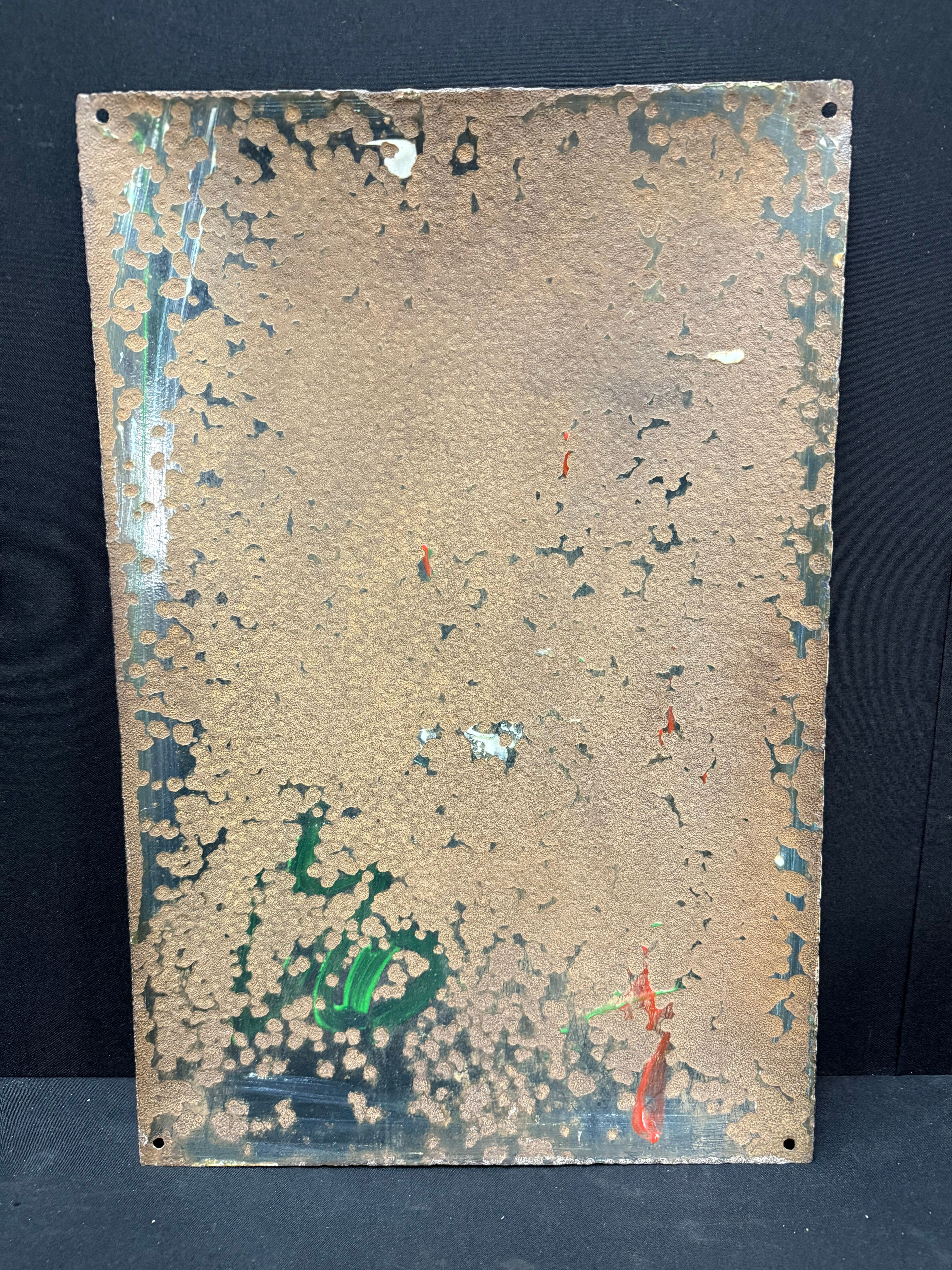 Toll in Glanz und Farbe. Version mit weißen Balken und Blockschrift. Geplatzte Emailleblase im Kleid. Sonst im Motiv gänzlich unbeschädigt. Nicht einmal eine Spinne im Bereich der Dame; was selten vorkommt. Ca. 60 x 40 cm.
