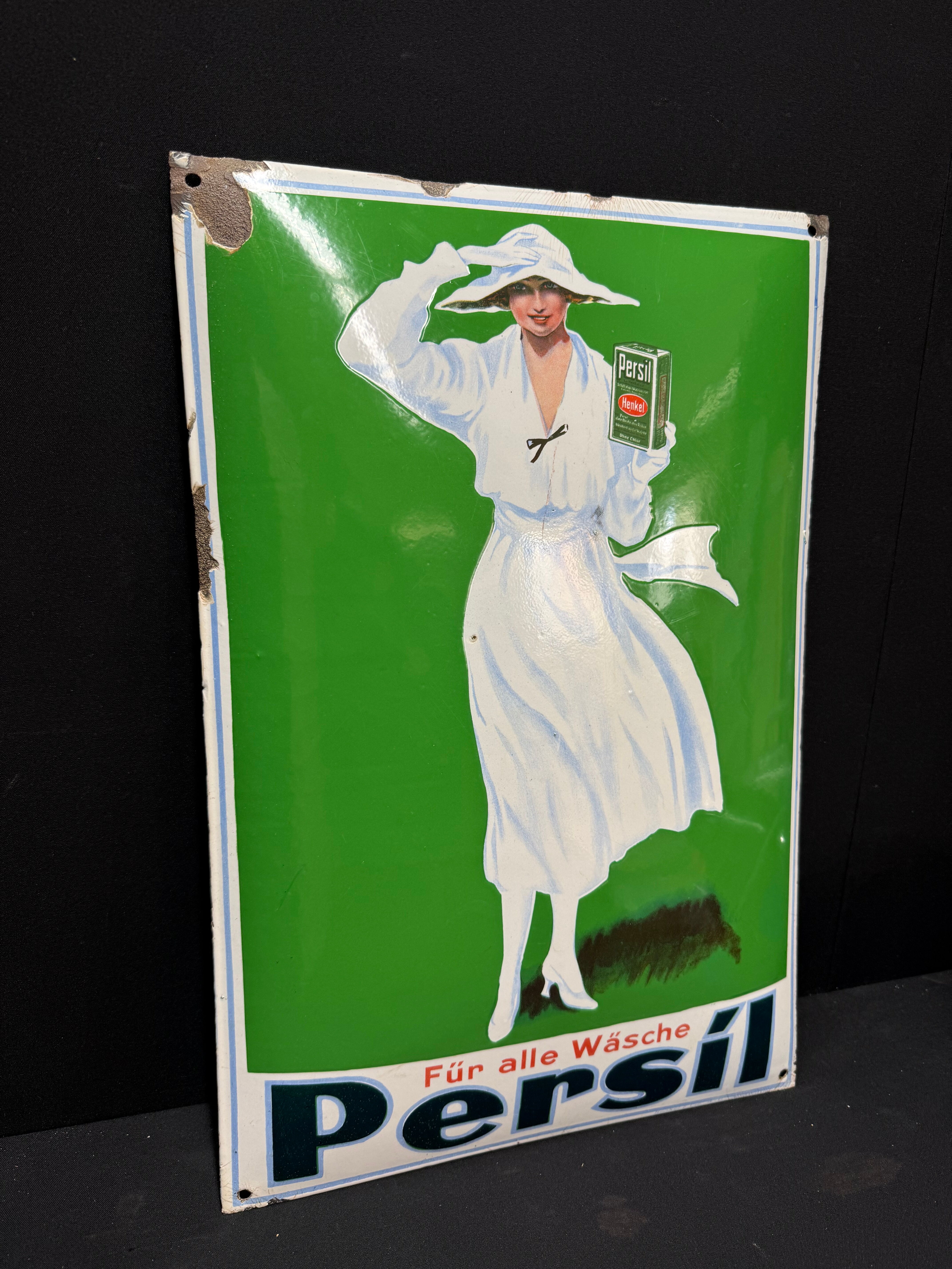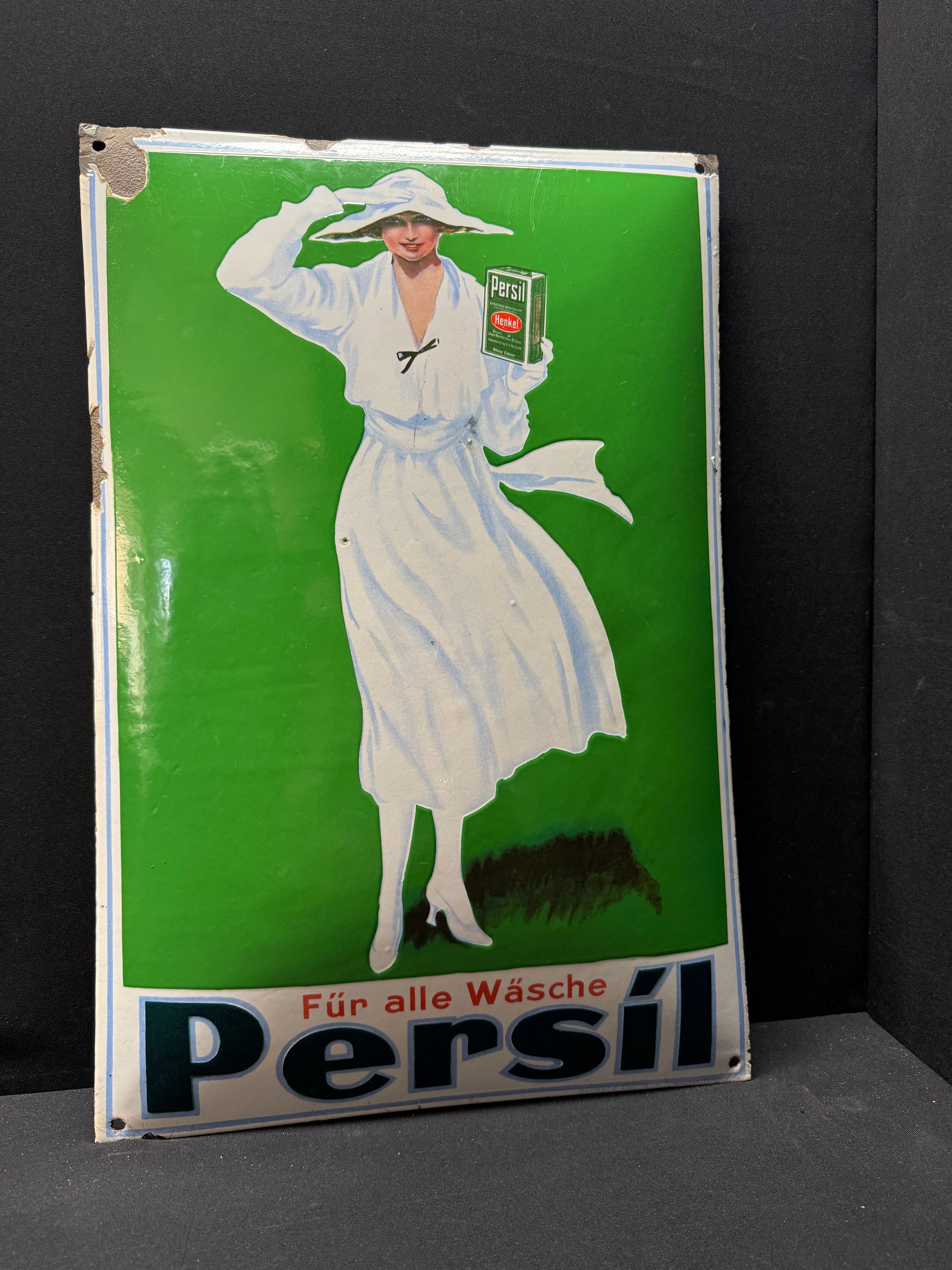 Persil Weiße Dame (Entwurf Kurt Heiligenstedt - Gewölbtes Emailleschild um 1925)