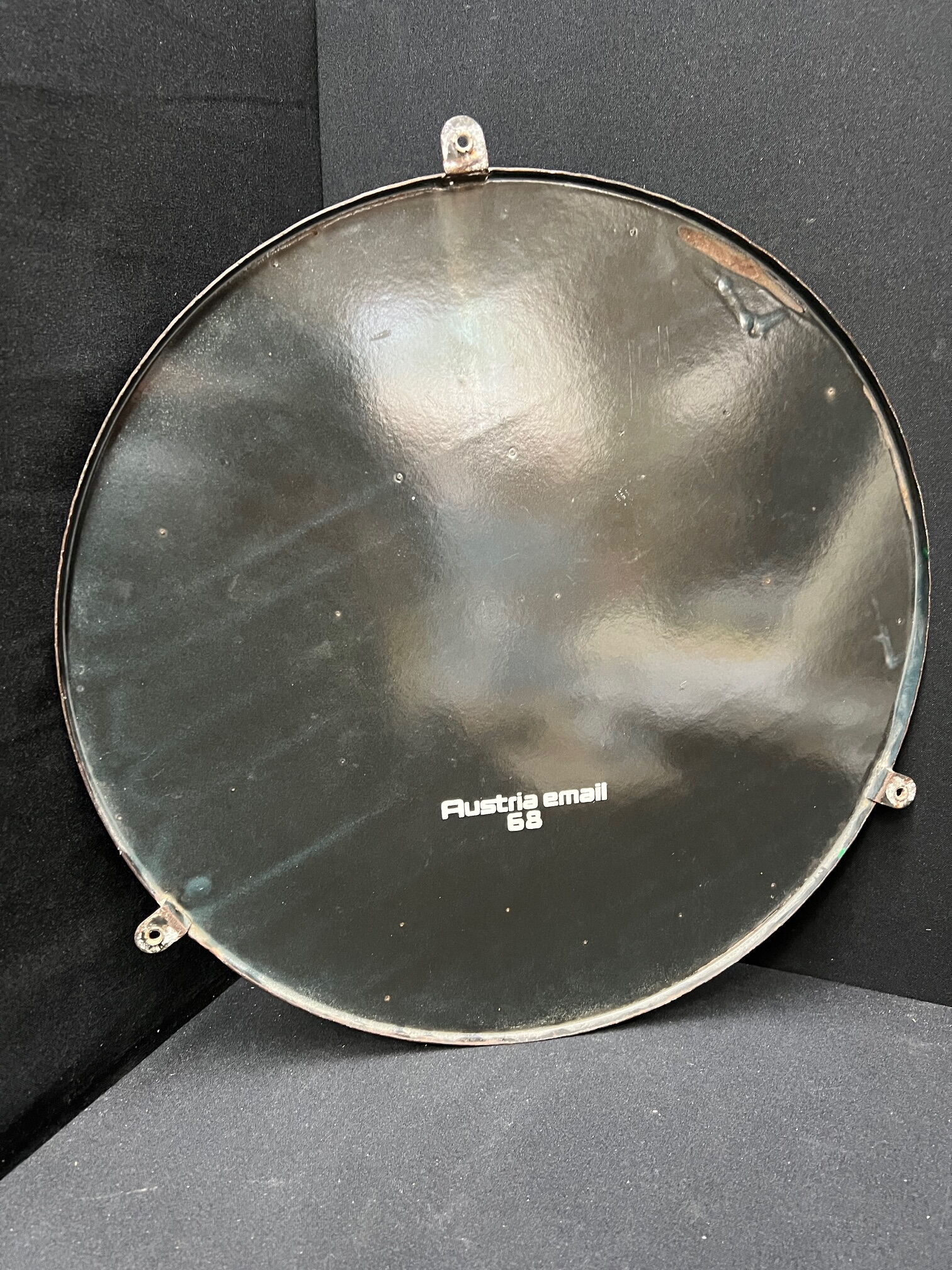 Schild hat einen absolut fantastischen Glanz. 40 cm im Durchmesser. In Österreich gefertigt. Flach mit Abkantung. Keinerlei Abplatzer, was wirklich selten vorkommt. Kaum möglich dieses Schild in noch besserer Erhaltung zu ergattern.