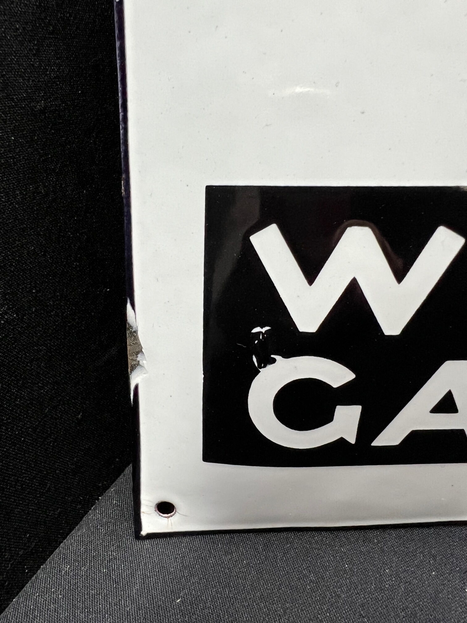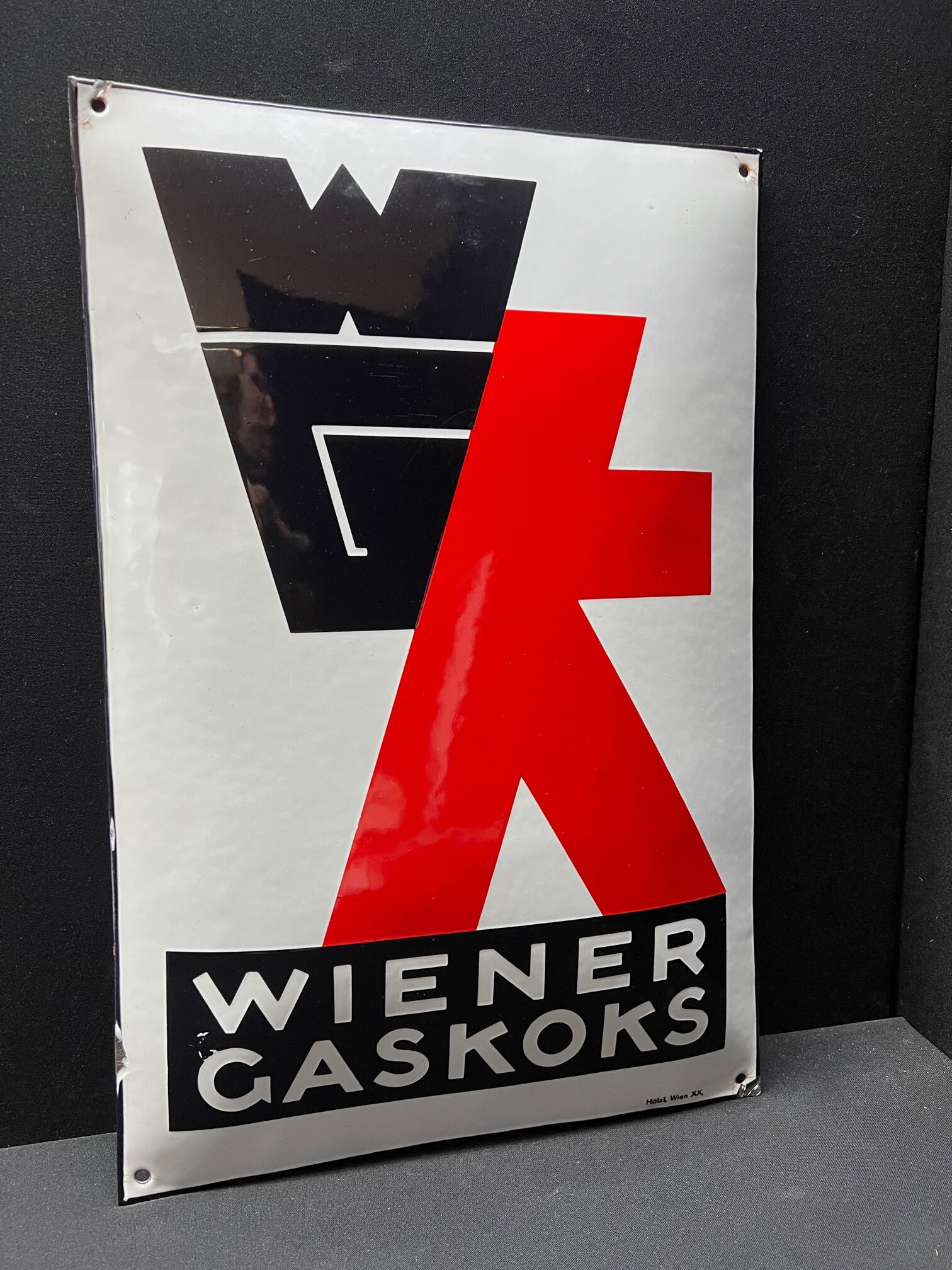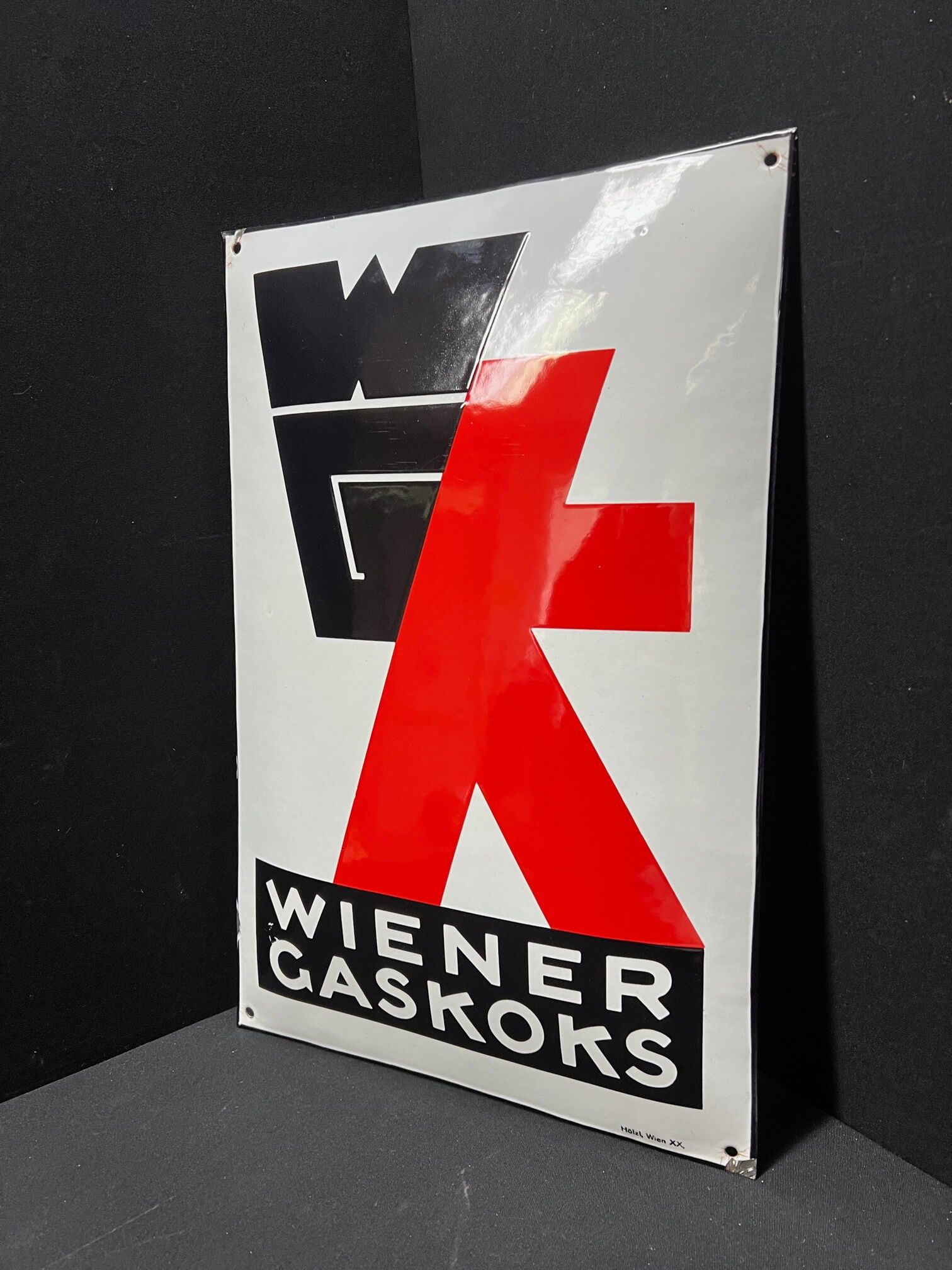 Wow! Was für eine geniales Schild. Hochglänzende Oberfläche ohne Kratzer. Dazu eine Grafik der Meisterklasse. Aus den Firmenbuchstaben W, G und K wurde hier ein Männchen mit schwer befüllten Kohlesack kreiert. Schäden halten sich stark in Grenzen. Unten im schwarzen Balken zwischen den Buchstaben W und G ein kleiner Emaillierfehler und KEINE Beschädigung.