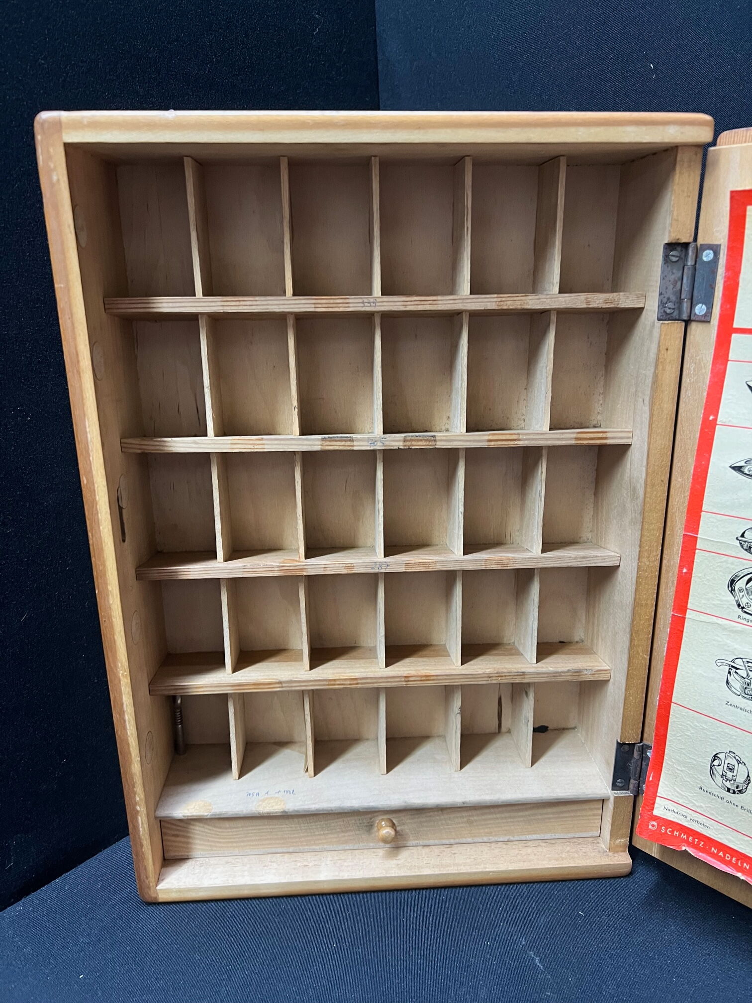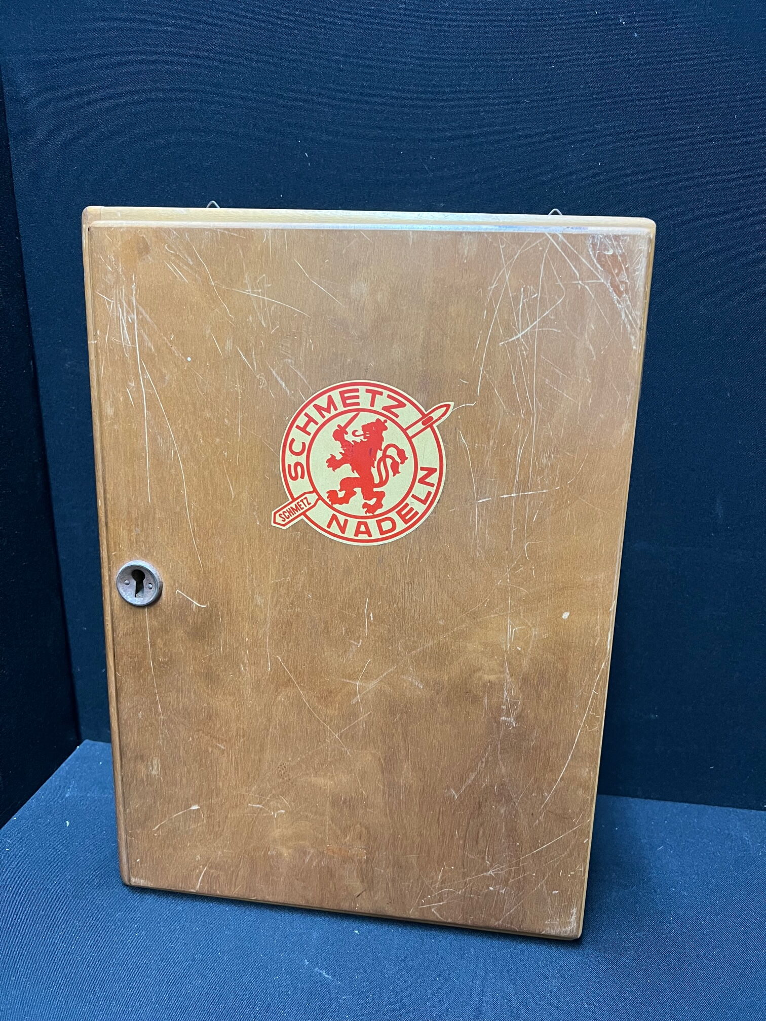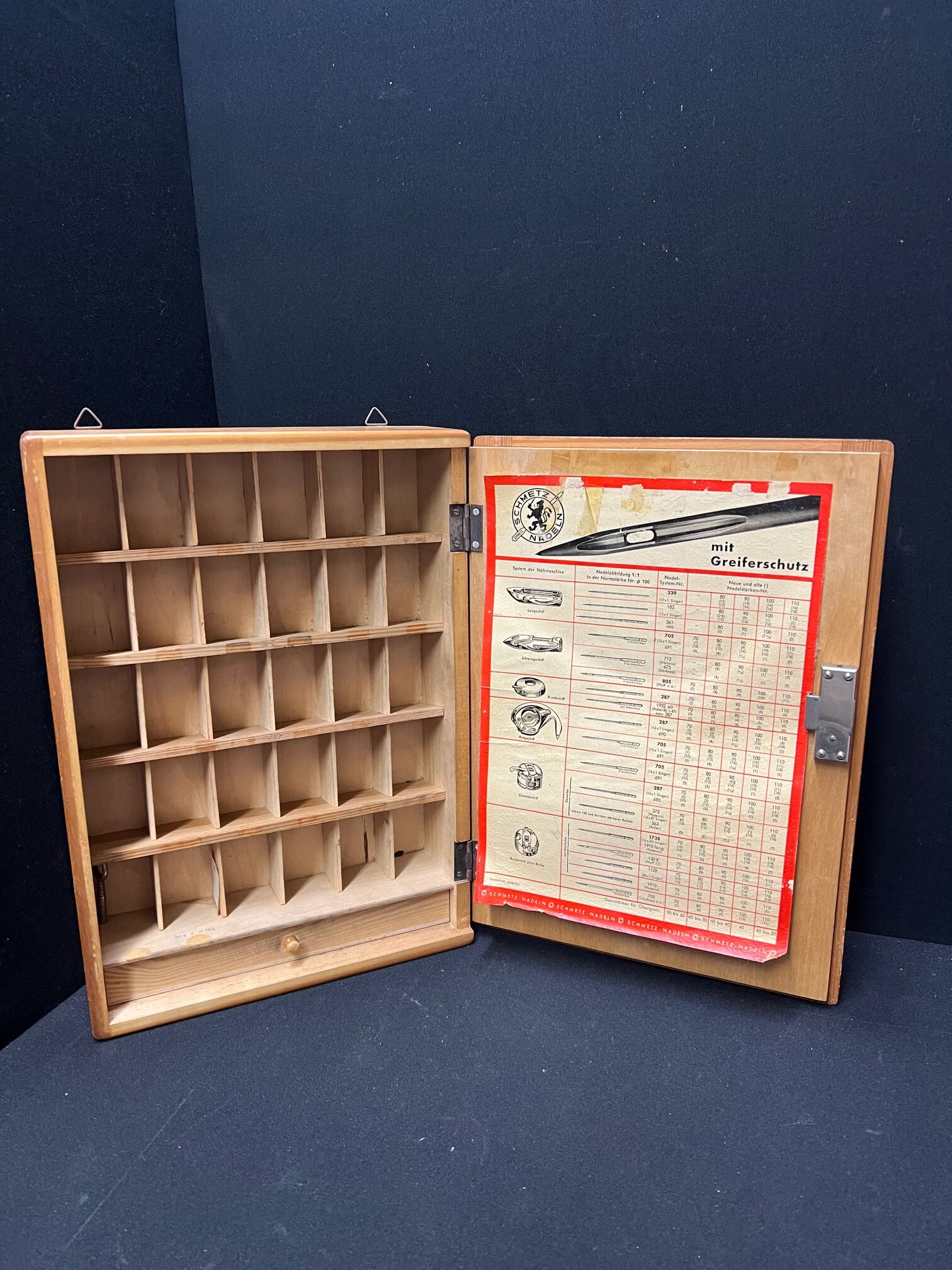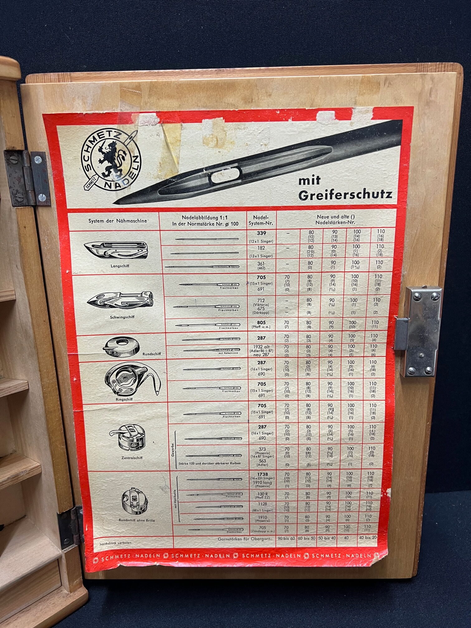 Schmetzt Nähmaschinen-Nadeln - 50er Jahre Verkaufsschränkchen (Innen mit grafischem Infoblatt)